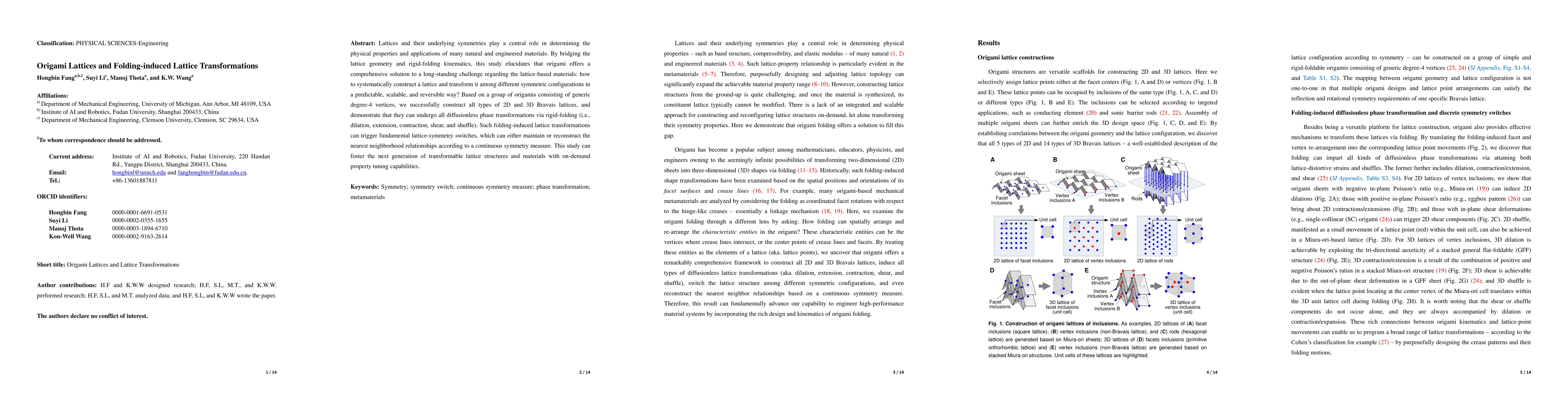 Lattices and their underlying symmetries play a central role in determining the physical properties and applications of many natural and engineered materials. By bridging the lattice geometry and rigid-folding kinematics, this study elucidates that origami offers a comprehensive solution to a long-standing challenge regarding the lattice-based materials: how to systematically construct a lattice and transform it among different symmetric configurations in a predictable, scalable, and reversible way? Based on a group of origamis consisting of generic degree-4 vertices, we successfully construct all types of 2D and 3D Bravais lattices, and demonstrate that they can undergo all diffusionless phase transformations via rigid-folding (i.e., dilation, extension, contraction, shear, and shuffle). Such folding-induced lattice transformations can trigger fundamental lattice-symmetry switches, which can either maintain or reconstruct the nearest neighborhood relationships according to a continuous symmetry measure. This study can foster the next generation of transformable lattice structures and materials with on-demand property tuning capabilities.