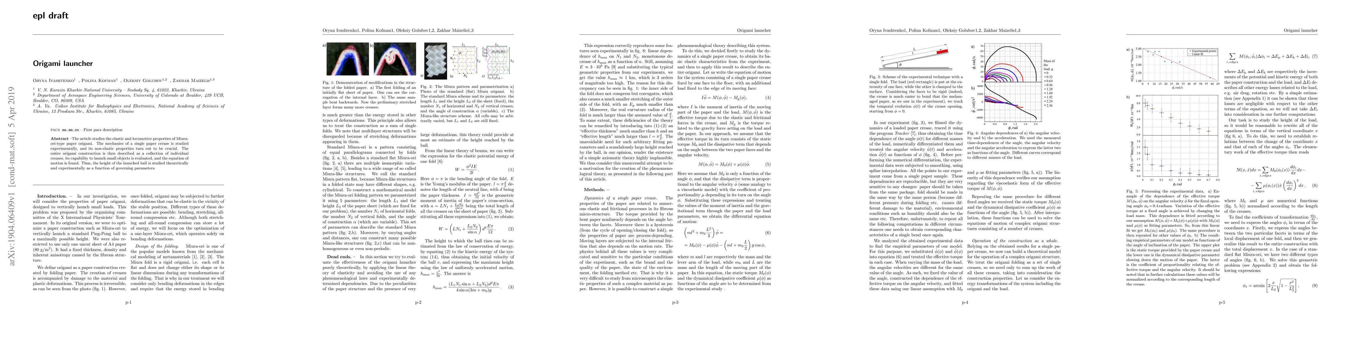 The article studies the elastic and locomotive properties of Miura-ori-type paper origami. The mechanics of a single paper crease is studied experimentally, and its non-elastic properties turn out to be crucial. The entire origami construction is then described as a collection of individual creases, its capability to launch small objects is evaluated, and the equation of motion is found. Thus, the height of the launched ball is studied theoretically and experimentally as a function of governing parameters.