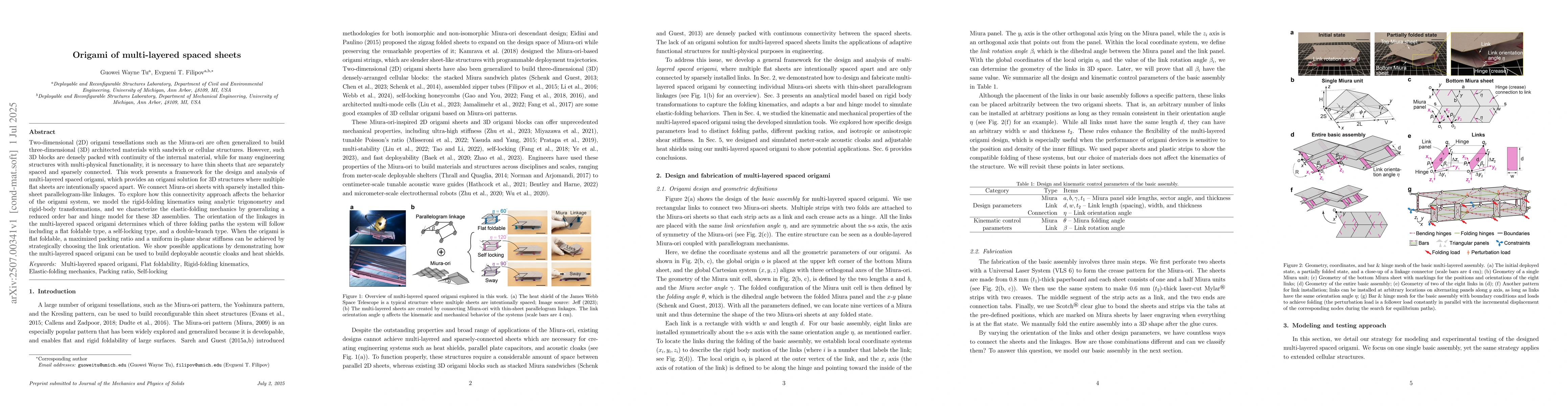 Two-dimensional (2D) origami tessellations such as the Miura-ori are often generalized to build three-dimensional (3D) architected materials with sandwich or cellular structures. However, such 3D blocks are densely packed with continuity of the internal material, while for many engineering structures with multi-physical functionality, it is necessary to have thin sheets that are separately spaced and sparsely connected. This work presents a framework for the design and analysis of multi-layered spaced origami, which provides an origami solution for 3D structures where multiple flat sheets are intentionally spaced apart. We connect Miura-ori sheets with sparsely installed thin-sheet parallelogram-like linkages. To explore how this connectivity approach affects the behavior of the origami system, we model the rigid-folding kinematics using analytic trigonometry and rigid-body transformations, and we characterize the elastic-folding mechanics by generalizing a reduced order bar and hinge model for these 3D assemblies. The orientation of the linkages in the multi-layered spaced origami determines which of three folding paths the system will follow including a flat foldable type, a self-locking type, and a double-branch type. When the origami is flat foldable, a maximized packing ratio and a uniform in-plane shear stiffness can be achieved by strategically choosing the link orientation. We show possible applications by demonstrating how the multi-layered spaced origami can be used to build deployable acoustic cloaks and heat shields.