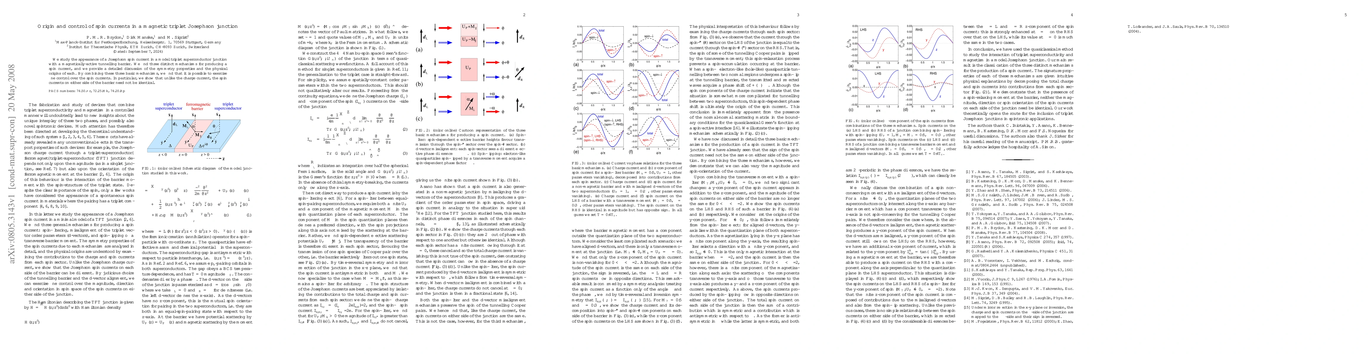 We study the appearance of a Josephson spin current in a model triplet superconductor junction with a magnetically-active tunnelling barrier. We find three distinct mechanisms for producing a spin current, and we provide a detailed discussion of the symmetry properties and the physical origins of each. By combining these three basic mechanisms, we find that it is possible to exercise fine control over the spin currents. In particular, we show that unlike the charge current, the spin currents on either side of the barrier need not be identical.