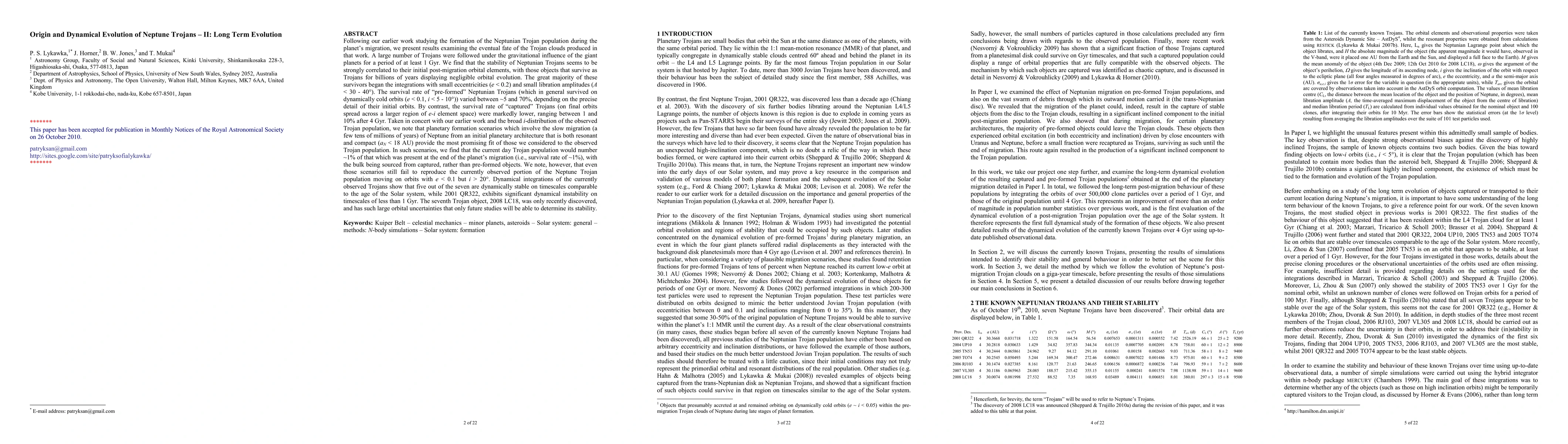 A study found that Neptune Trojans' stability is linked to their initial orbital elements, with most surviving for billions of years; planetary formation scenarios involving slow Neptune migration provide the best fit for observed Trojan populations.