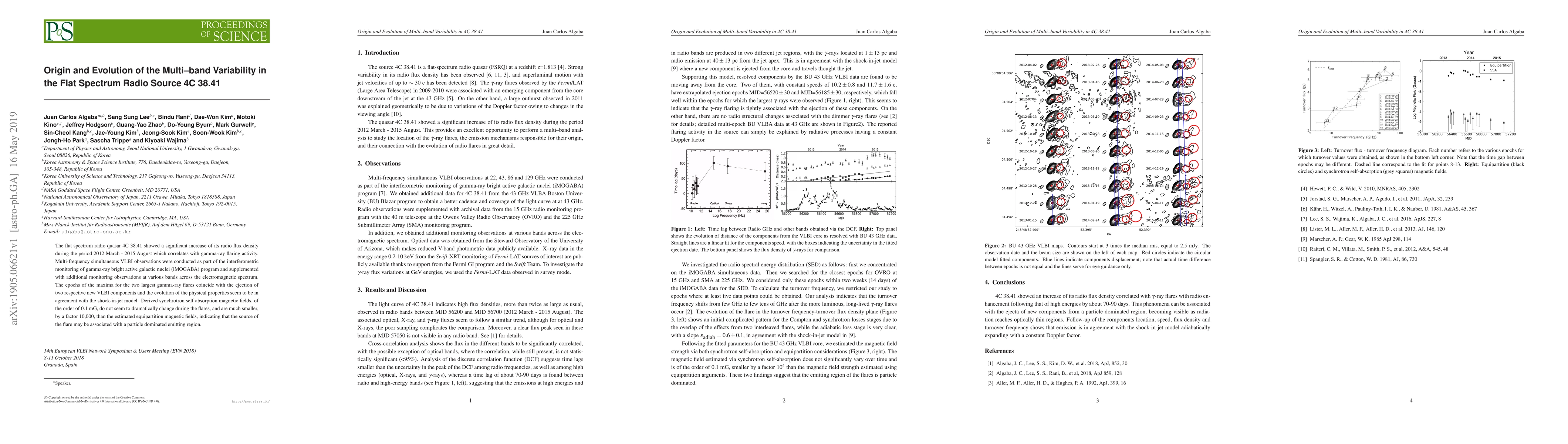 The flat spectrum radio quasar 4C 38.41 showed a significant increase of its radio flux density during the period 2012 March - 2015 August which correlates with gamma-ray flaring activity. Multi-frequency simultaneous VLBI observations were conducted as part of the interferometric monitoring of gamma-ray bright active galactic nuclei (iMOGABA) program and supplemented with additional monitoring observations at various bands across the electromagnetic spectrum. The epochs of the maxima for the two largest gamma-ray flares coincide with the ejection of two respective new VLBI components and the evolution of the physical properties seem to be in agreement with the shock-in-jet model. Derived synchrotron self absorption magnetic fields, of the order of 0.1 mG, do not seem to dramatically change during the flares, and are much smaller, by a factor 10,000, than the estimated equipartition magnetic fields, indicating that the source of the flare may be associated with a particle dominated emitting region.