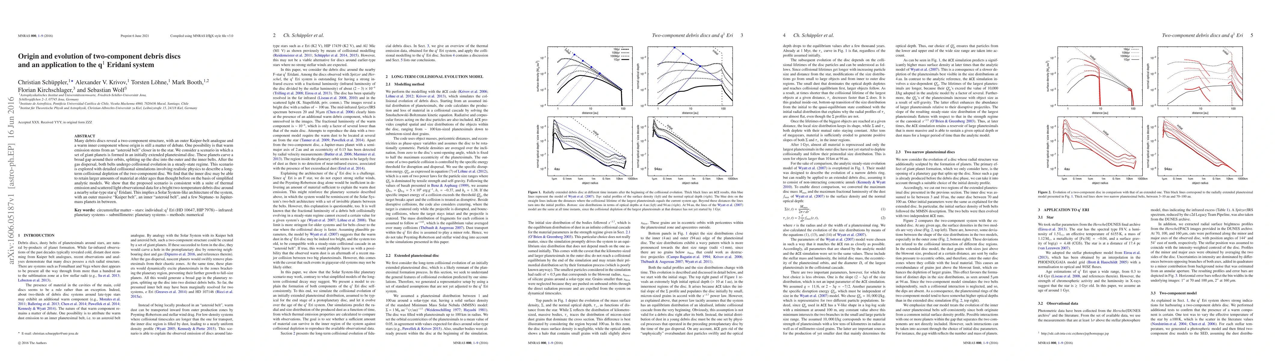 Many debris discs reveal a two-component structure, with an outer Kuiper-belt analogue and a warm inner component whose origin is still a matter of debate. One possibility is that warm emission stems from an "asteroid belt" closer in to the star. We consider a scenario in which a set of giant planets is formed in an initially extended planetesimal disc. These planets carve a broad gap around their orbits, splitting up the disc into the outer and the inner belts. After the gas dispersal, both belts undergo collisional evolution in a steady-state regime. This scenario is explored with detailed collisional simulations involving realistic physics to describe a long-term collisional depletion of the two-component disc. We find that the inner disc may be able to retain larger amounts of material at older ages than thought before on the basis of simplified analytic models. We show that the proposed scenario is consistent with a suite of thermal emission and scattered light observational data for a bright two-temperature debris disc around a nearby solar-type star q$^1$ Eridani. This implies a Solar System-like architecture of the system, with an outer massive "Kuiper belt", an inner "asteroid belt", and a few Neptune- to Jupiter-mass planets in between.