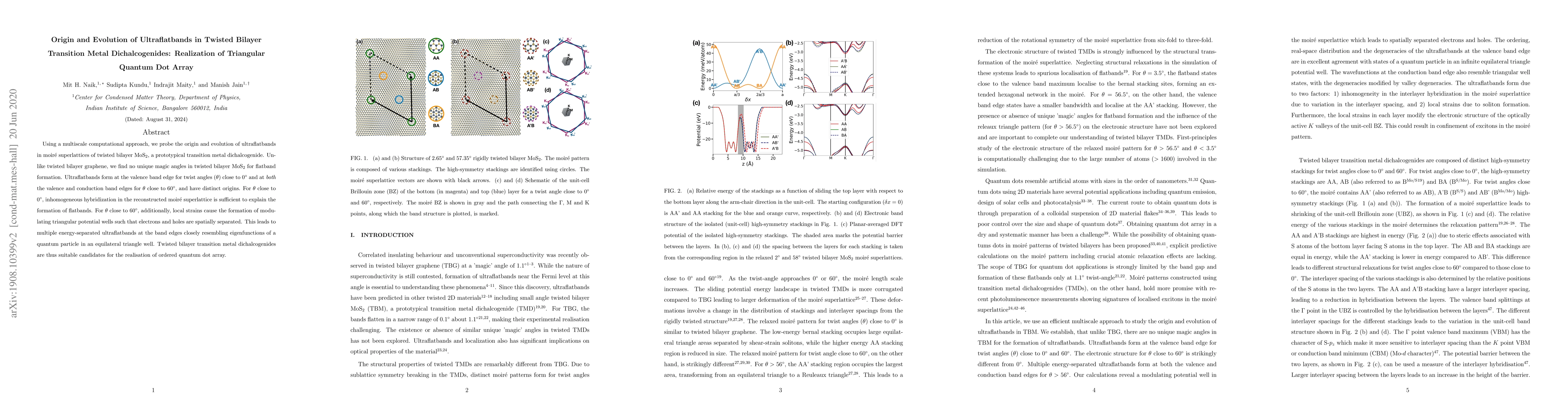 Using a multiscale computational approach, we probe the origin and evolution of ultraflatbands in moir\'e superlattices of twisted bilayer MoS$_2$, a prototypical transition metal dichalcogenide. Unlike twisted bilayer graphene, we find no unique magic angles in twisted bilayer MoS$_2$ for flatband formation. Ultraflatbands form at the valence band edge for twist angles ($\theta$) close to 0$^\circ$ and at both the valence and conduction band edges for $\theta$ close to 60$^\circ$, and have distinct origins. For$ \theta$ close to 0$^\circ$, inhomogeneous hybridization in the reconstructed moir\'e superlattice is sufficient to explain the formation of flatbands. For $\theta$ close to 60$^\circ$, additionally, local strains cause the formation of modulating triangular potential wells such that electrons and holes are spatially separated. This leads to multiple energy-separated ultraflatbands at the band edges closely resembling eigenfunctions of a quantum particle in an equilateral triangle well. Twisted bilayer transition metal dichalcogenides are thus suitable candidates for the realisation of ordered quantum dot array.