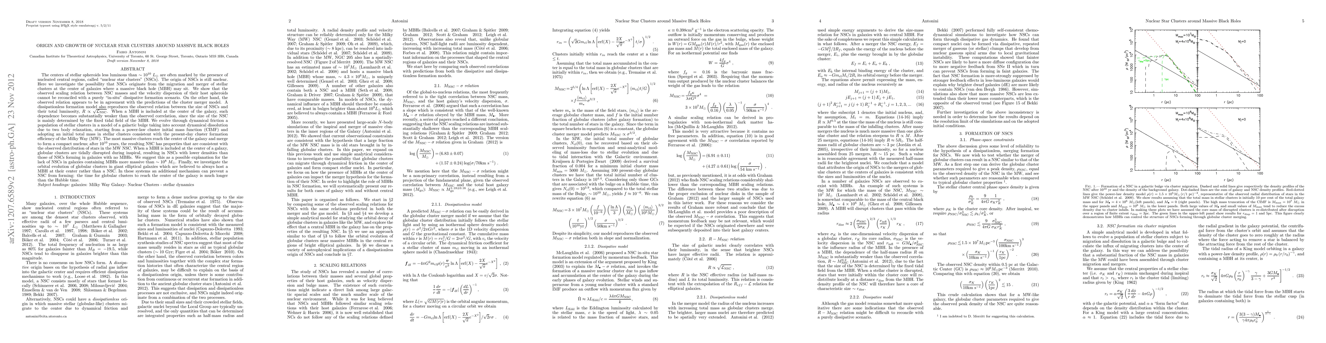 The centers of stellar spheroids are often marked by the presence of nucleated central regions, called nuclear star clusters (NSCs). The origin of NSCs is still unclear. Here we investigate the possibility that NSCs originate from the migration and merger of stellar clusters at the center of galaxies where a massive black hole (MBH) may sit. We show that the observed relation between NSC masses and the velocity dispersion of their host spheroids cannot be reconciled with a purely in-situ formation scenario. On the other hand, the observed relation appears to be in agreement with the predictions of the cluster merger model which also reproduces the observed relation between the size of NSCs and their total luminosity. We evolve through dynamical friction a population of stellar clusters in a model of a galactic bulge taking into account dynamical dissolution, starting from a power-law cluster initial mass function and a total mass in stellar clusters consistent with the cluster formation efficiency of the Milky Way (MW). The most massive clusters reach the center of the galaxy and merge to form a compact nucleus; after 10 Gyr, the resulting NSC has properties that are consistent with the observed distribution of stars in the MW NSC. When a MBH is included at the center of a galaxy, globular clusters are tidally disrupted during inspiral, resulting in NSCs with lower densities than those of NSCs forming in galaxies with no MBHs. We suggest this as a possible explanation for the lack of NSCs in galaxies containing MBHs more massive than ~10^8M_Sun. Finally, we investigate the orbital evolution of globular clusters in giant elliptical galaxies which are believed to always host a MBH at their center rather than a NSC. In these systems an additional mechanism can prevent a NSC from forming: the time for globular clusters to reach the center of the galaxy is much longer than the Hubble time.