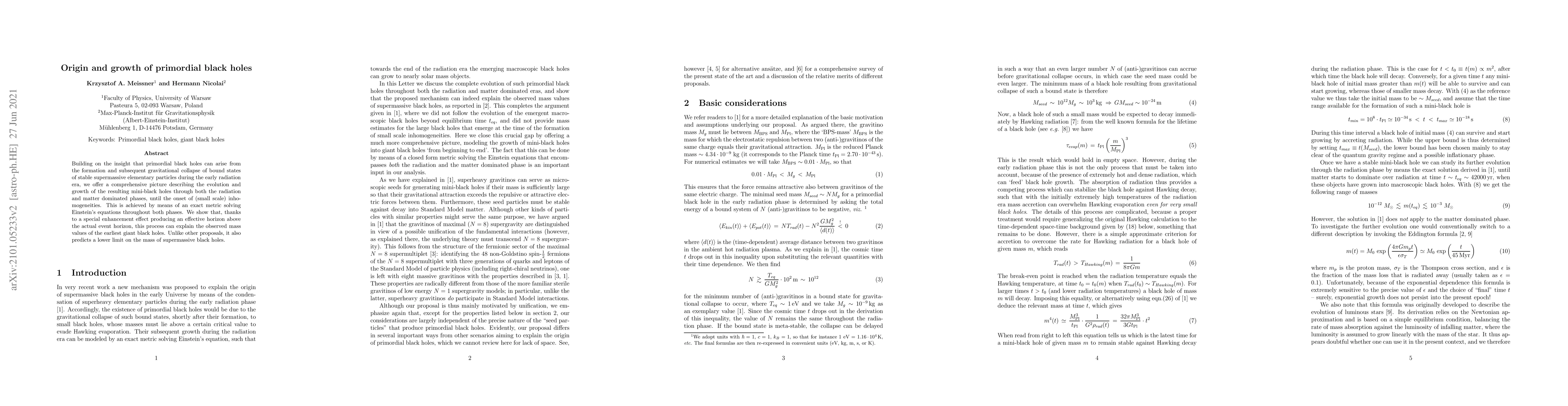 This paper explores the formation and growth of primordial black holes from stable supermassive elementary particles during the early universe, providing an exact metric solution for their evolution. It explains the emergence of early giant black holes and predicts a minimum mass for supermassive black holes, differing from other models.