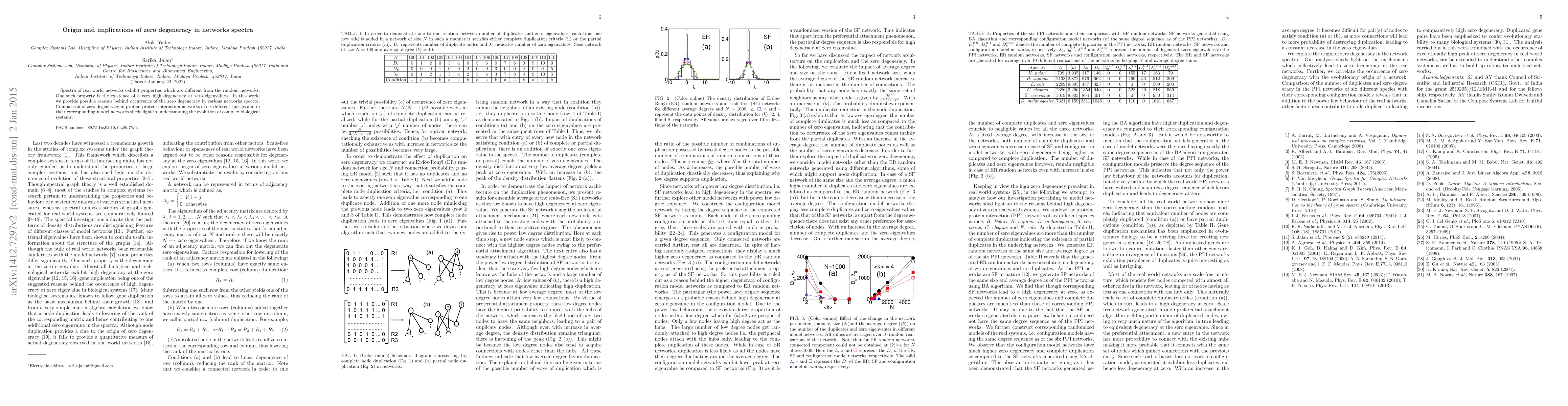 Spectra of real world networks exhibit properties which are different from the random networks. One such property is the existence of a very high degeneracy at zero eigenvalues. In this work, we provide possible reasons behind occurrence of the zero degeneracy in various networks spectra. Comparison of zero degeneracy in protein-protein interaction networks of six different species and in their corresponding model networks sheds light in understanding the evolution of complex biological systems.
