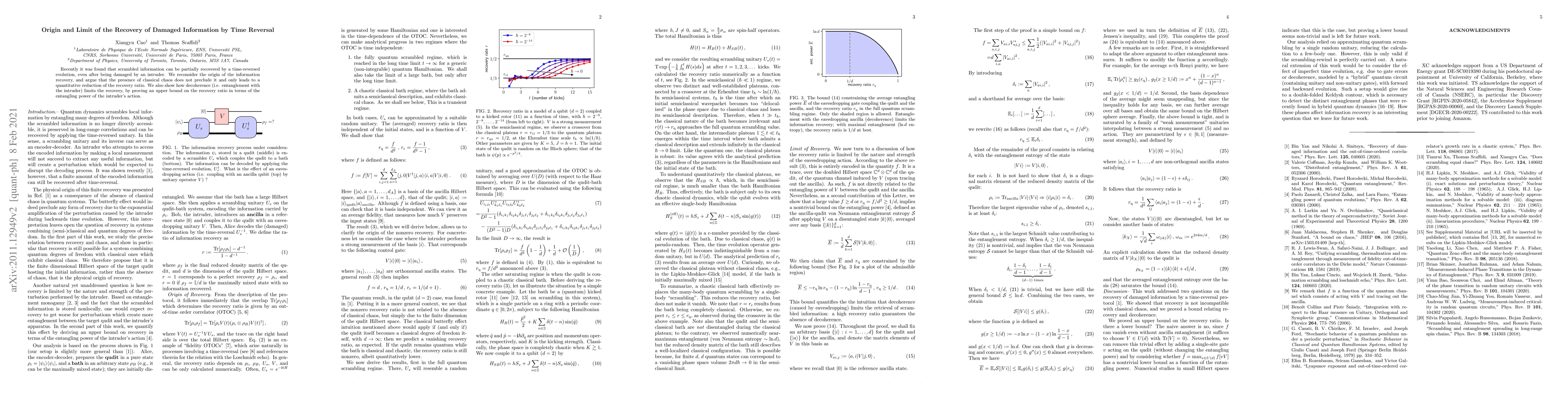 This paper explores the recovery of damaged information through time-reversed evolution, demonstrating that classical chaos does not prevent recovery but reduces it quantitatively. It also establishes an upper bound on recovery ratio based on the intruder's entangling power, illustrating how decoherence limits information recovery.