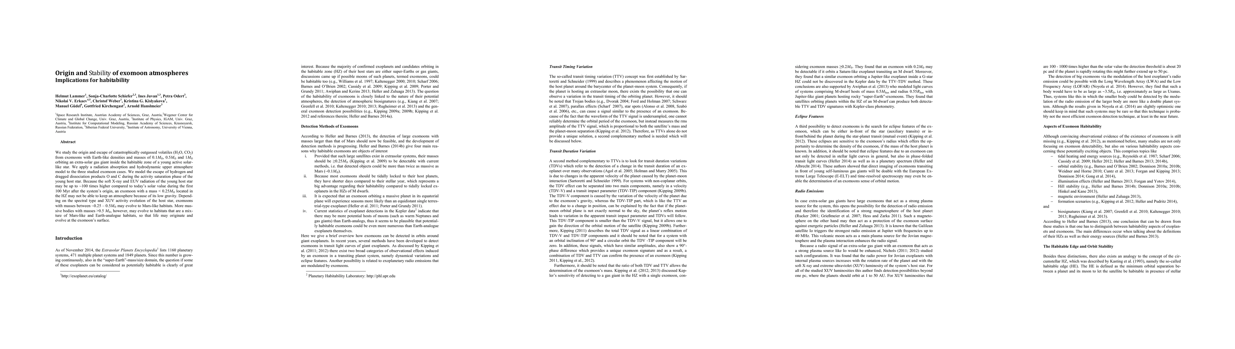 We study the origin and escape of catastrophically outgassed volatiles (H$_2$O, CO$_2$) from exomoons with Earth-like densities and masses of $0.1M_{\oplus}$, $0.5M_{\oplus}$ and $1M_{\oplus}$ orbiting an extra-solar gas giant inside the habitable zone of a young active solar-like star. We apply a radiation absorption and hydrodynamic upper atmosphere model to the three studied exomoon cases. We model the escape of hydrogen and dragged dissociation products O and C during the activity saturation phase of the young host star. Because the soft X-ray and EUV radiation of the young host star may be up to $\sim$100 times higher compared to today's solar value during the first 100 Myr after the system's origin, an exomoon with a mass $ < 0.25M_{\oplus}$ located in the HZ may not be able to keep an atmosphere because of its low gravity. Depending on the spectral type and XUV activity evolution of the host star, exomoons with masses between $\sim0.25-0.5M_{\oplus}$ may evolve to Mars-like habitats. More massive bodies with masses $ > 0.5M_{\oplus}$, however, may evolve to habitats that are a mixture of Mars-like and Earth-analogue habitats, so that life may originate and evolve at the exomoon's surface.