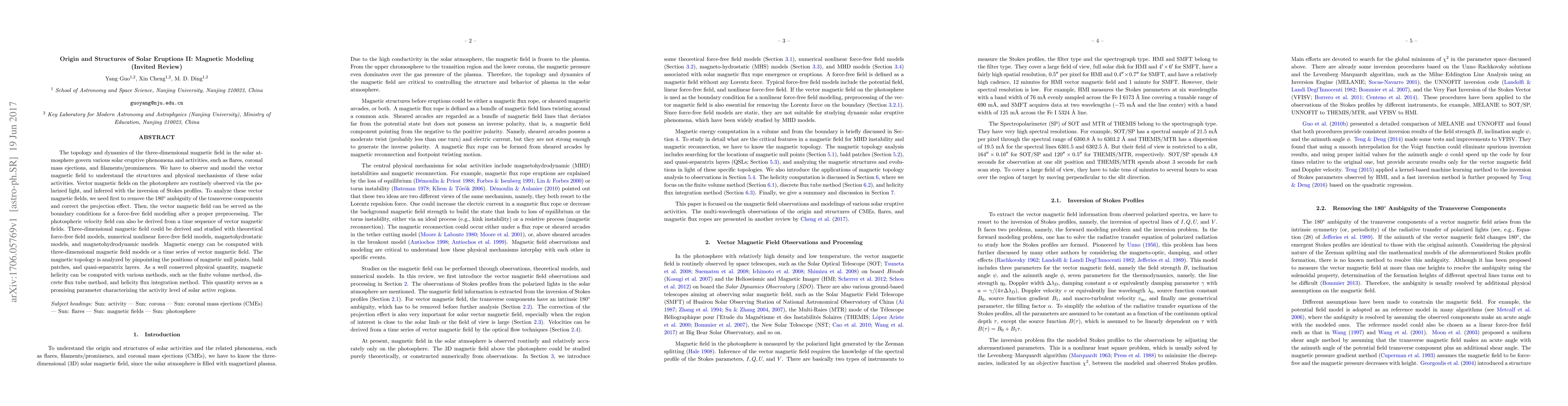 This paper reviews the modeling of the three-dimensional magnetic field in the solar atmosphere to understand solar eruptive phenomena like flares and coronal mass ejections. It discusses methods to remove ambiguities and projection effects in vector magnetic fields, and employs various modeling techniques to analyze magnetic topology and helicity.