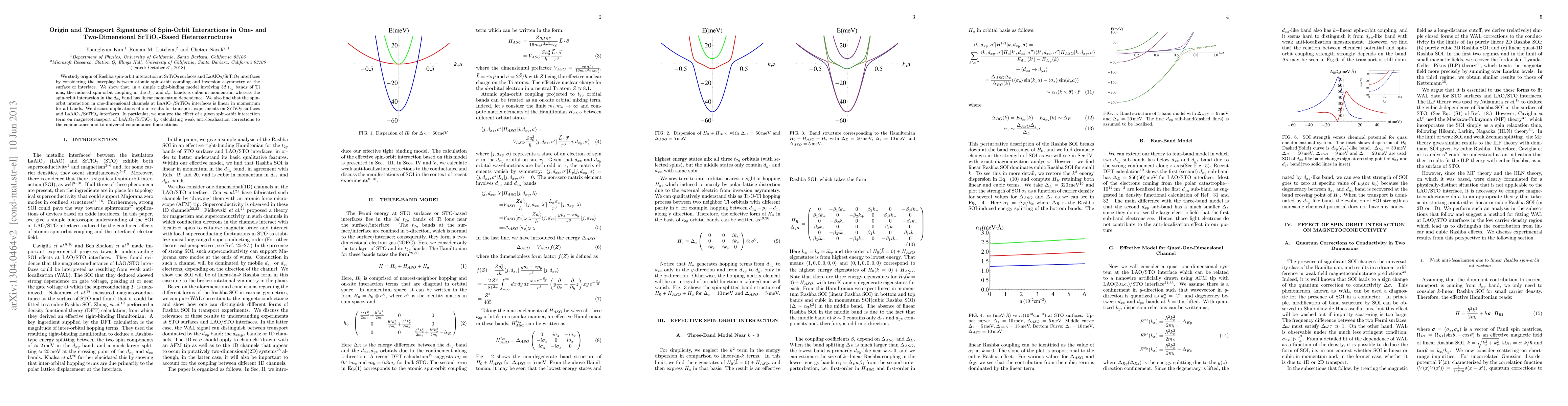 This paper investigates the origin of Rashba spin-orbit interactions in SrTiO$_3$ surfaces and LaAlO$_3$/SrTiO$_3$ interfaces, revealing different momentum dependencies in various bands and discussing their transport signatures, including weak anti-localization effects in magnetotransport.