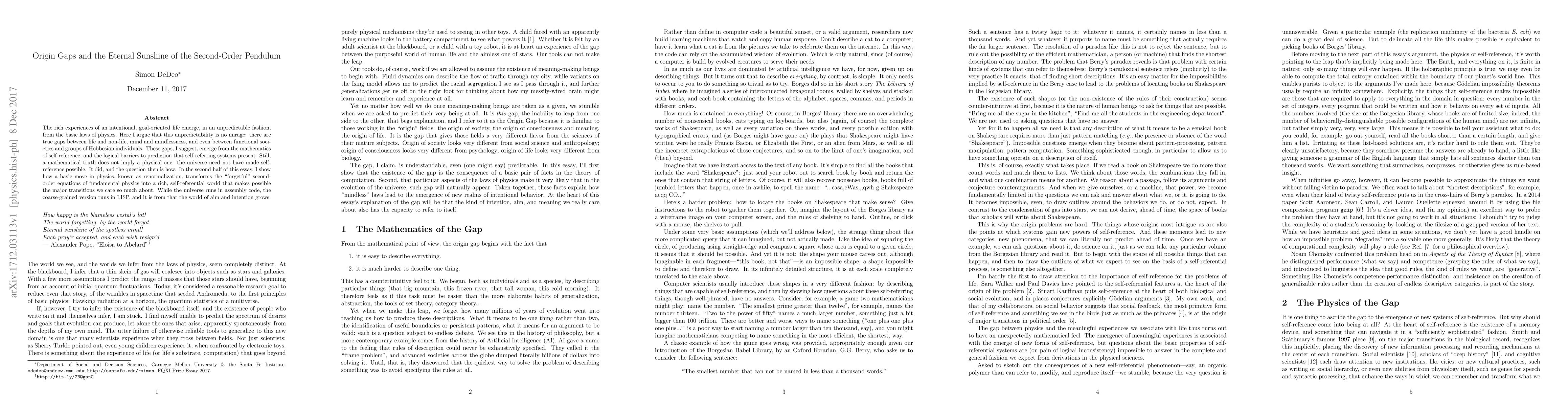 The rich experiences of an intentional, goal-oriented life emerge, in an unpredictable fashion, from the basic laws of physics. Here I argue that this unpredictability is no mirage: there are true gaps between life and non-life, mind and mindlessness, and even between functional societies and groups of Hobbesian individuals. These gaps, I suggest, emerge from the mathematics of self-reference, and the logical barriers to prediction that self-referring systems present. Still, a mathematical truth does not imply a physical one: the universe need not have made self-reference possible. It did, and the question then is how. In the second half of this essay, I show how a basic move in physics, known as renormalization, transforms the "forgetful" second-order equations of fundamental physics into a rich, self-referential world that makes possible the major transitions we care so much about. While the universe runs in assembly code, the coarse-grained version runs in LISP, and it is from that the world of aim and intention grows.