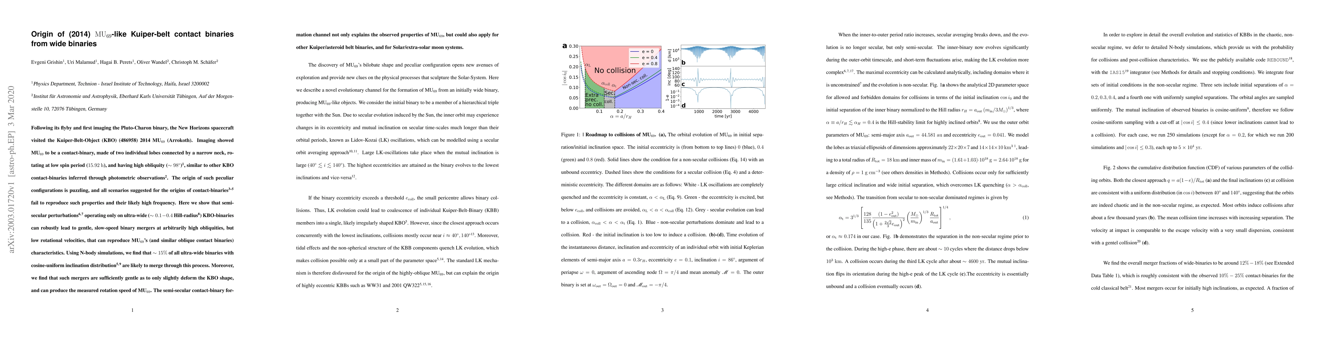 This paper proposes that semi-secular perturbations in ultra-wide Kuiper Belt Object (KBO) binaries can lead to the formation of contact binaries like (2014) MU69 through gentle, slow-speed mergers. N-body simulations suggest that this process can reproduce the observed characteristics of MU69 and similar objects, explaining their high obliquity and low rotational velocities.