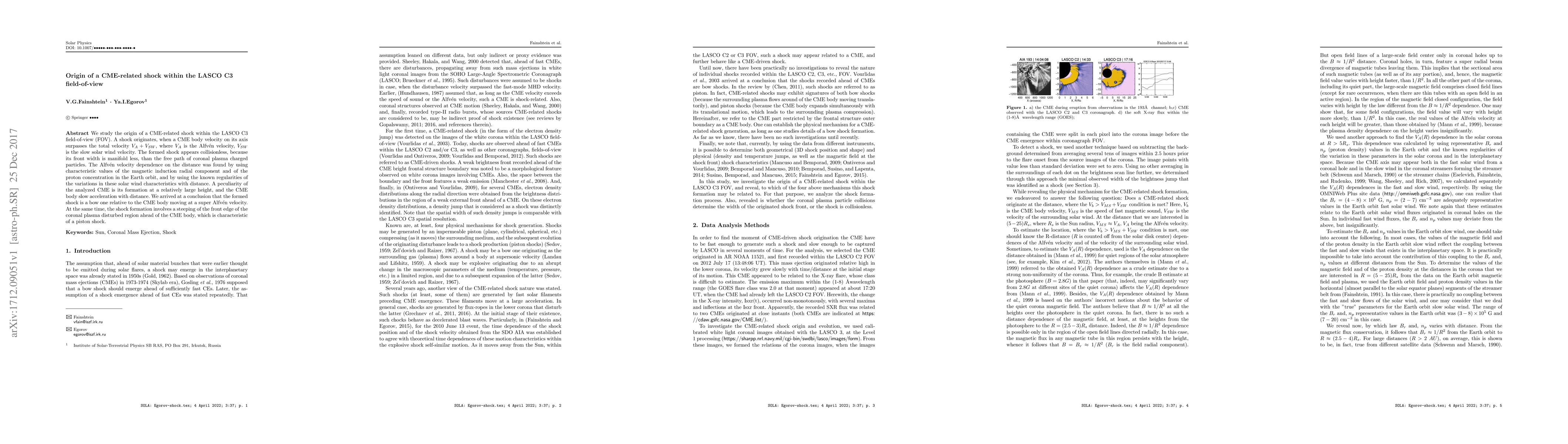 We study the origin of a CME-related shock within the LASCO C3 field-of-view (FOV). A shock originates, when a CME body velocity on its axis surpasses the total velocity $V_A + V_{SW}$, where $V_A$ is the Alfv\'en velocity, $V_{SW}$ is the slow solar wind velocity. The formed shock appears collisionless, because its front width is manifold less, than the free path of coronal plasma charged particles. The Alfv\'en velocity dependence on the distance was found by using characteristic values of the magnetic induction radial component and of the proton concentration in the Earth orbit, and by using the known regularities of the variations in these solar wind characteristics with distance. A peculiarity of the analyzed CME is its formation at a relatively large height, and the CME body slow acceleration with distance. We arrived at a conclusion that the formed shock is a bow one relative to the CME body moving at a super Alfv\'en velocity. At the same time, the shock formation involves a steeping of the front edge of the coronal plasma disturbed region ahead of the CME body, which is characteristic of a piston shock.
