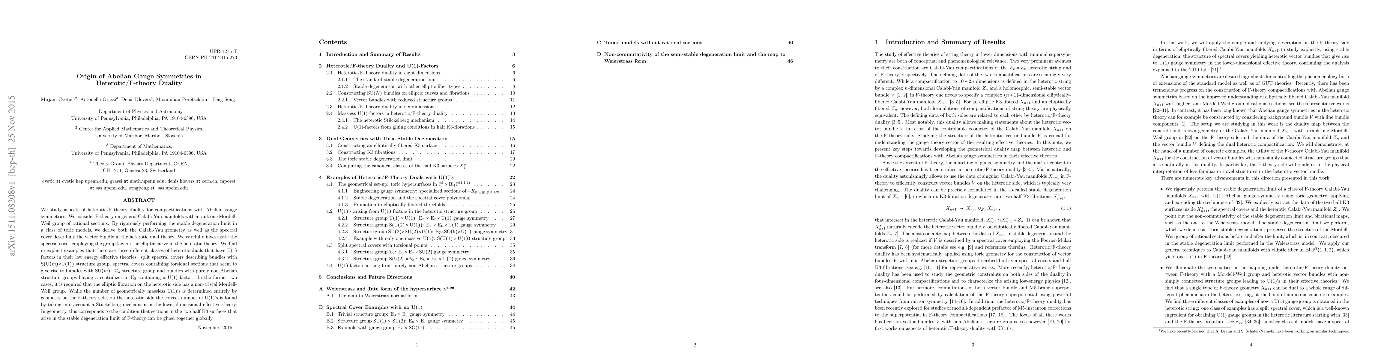 We study aspects of heterotic/F-theory duality for compactifications with Abelian gauge symmetries. We consider F-theory on general Calabi-Yau manifolds with a rank one Mordell-Weil group of rational sections. By rigorously performing the stable degeneration limit in a class of toric models, we derive both the Calabi-Yau geometry as well as the spectral cover describing the vector bundle in the heterotic dual theory. We carefully investigate the spectral cover employing the group law on the elliptic curve in the heterotic theory. We find in explicit examples that there are three different classes of heterotic duals that have U(1) factors in their low energy effective theories: split spectral covers describing bundles with S(U(m) x U(1)) structure group, spectral covers containing torsional sections that seem to give rise to bundles with SU(m) x Z_k structure group and bundles with purely non-Abelian structure groups having a centralizer in E_8 containing a U(1) factor. In the former two cases, it is required that the elliptic fibration on the heterotic side has a non-trivial Mordell-Weil group. While the number of geometrically massless U(1)'s is determined entirely by geometry on the F-theory side, on the heterotic side the correct number of U(1)'s is found by taking into account a Stuckelberg mechanism in the lower-dimensional effective theory. In geometry, this corresponds to the condition that sections in the two half K3 surfaces that arise in the stable degeneration limit of F-theory can be glued together globally.