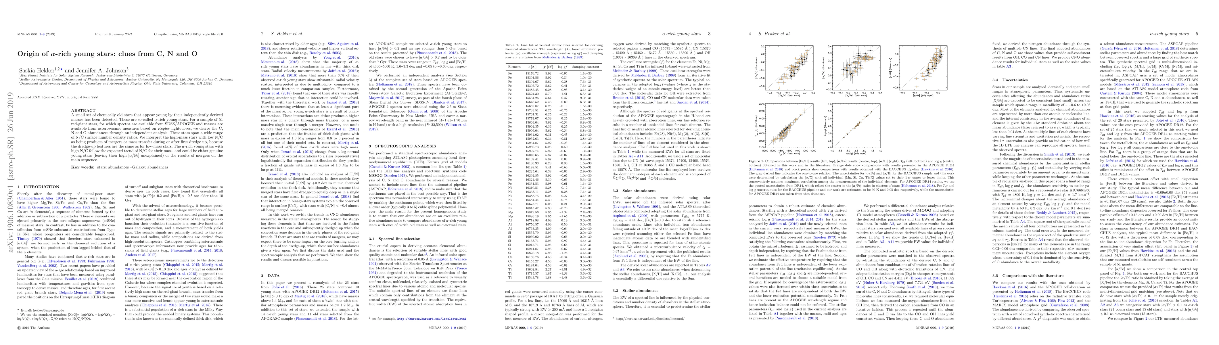 This research investigates the origins of $\alpha$-rich young stars through C, N, and O abundances in a sample of 51 red-giant stars. The study suggests that high-mass stars with low N/C ratios may result from stellar mergers or mass transfer, while those with high N/C ratios could either be genuine young stars or products of main sequence mergers.