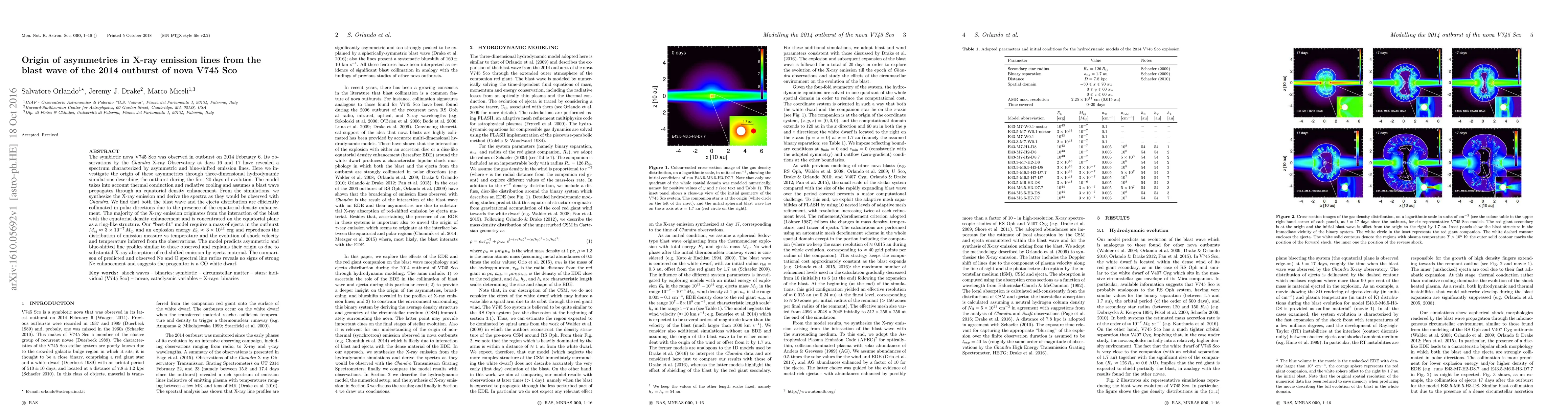 Researchers used simulations to investigate the origins of asymmetries in X-ray emission lines from the 2014 outburst of nova V745 Sco, finding that most emissions come from the interaction with an equatorial density enhancement.