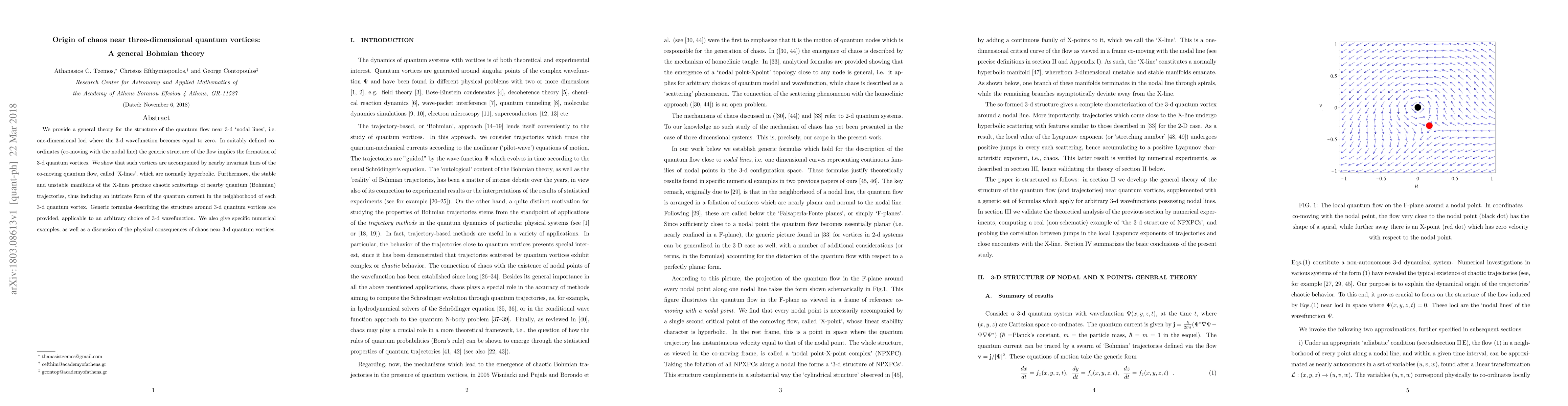We provide a general theory for the structure of the quantum flow near 3-d nodal lines, i.e. one-dimensional loci where the 3-d wavefunction becomes equal to zero. In suitably defined co- ordinates (co-moving with the nodal line) the generic structure of the flow implies the formation of 3-d quantum vortices. We show that such vortices are accompanied by nearby invariant lines of the co-moving quantum flow, called X-lines, which are normally hyperbolic. Furthermore, the stable and unstable manifolds of the X-lines produce chaotic scatterings of nearby quantum (Bohmian) trajectories, thus inducing an intricate form of the quantum current in the neighborhood of each 3-d quantum vortex. Generic formulas describing the structure around 3-d quantum vortices are provided, applicable to an arbitrary choice of 3-d wavefunction. We also give specific numerical examples, as well as a discussion of the physical consequences of chaos near 3-d quantum vortices.