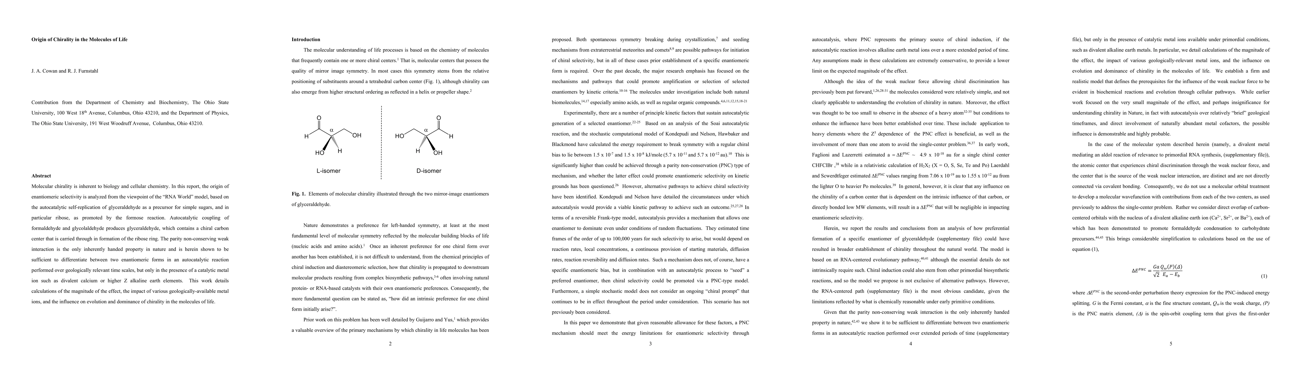 This research paper explores how chirality in molecules of life originated through the autocatalytic self-replication of a precursor sugar called glyceraldehyde, which requires metal ions like calcium to differentiate between two enantiomeric forms.