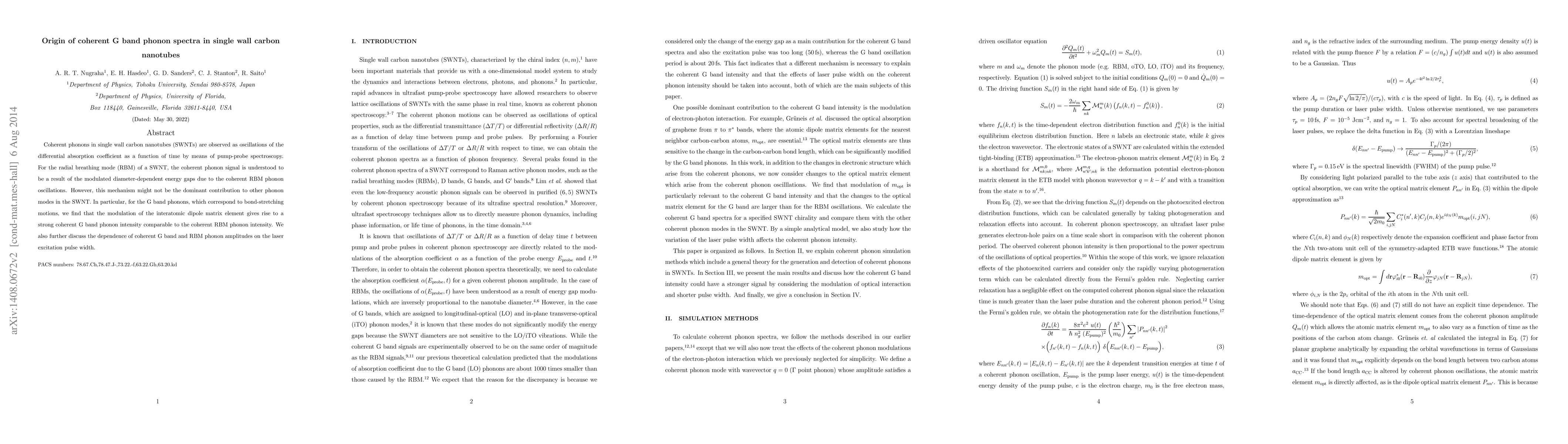 This research investigates the origin of coherent G band phonon spectra in single wall carbon nanotubes (SWNTs) using pump-probe spectroscopy, finding that modulation of the interatomic dipole matrix element significantly contributes to the coherent G band phonon intensity, comparable to that of the radial breathing mode phonons. The study also explores the effect of laser excitation pulse width on the phonon amplitudes.