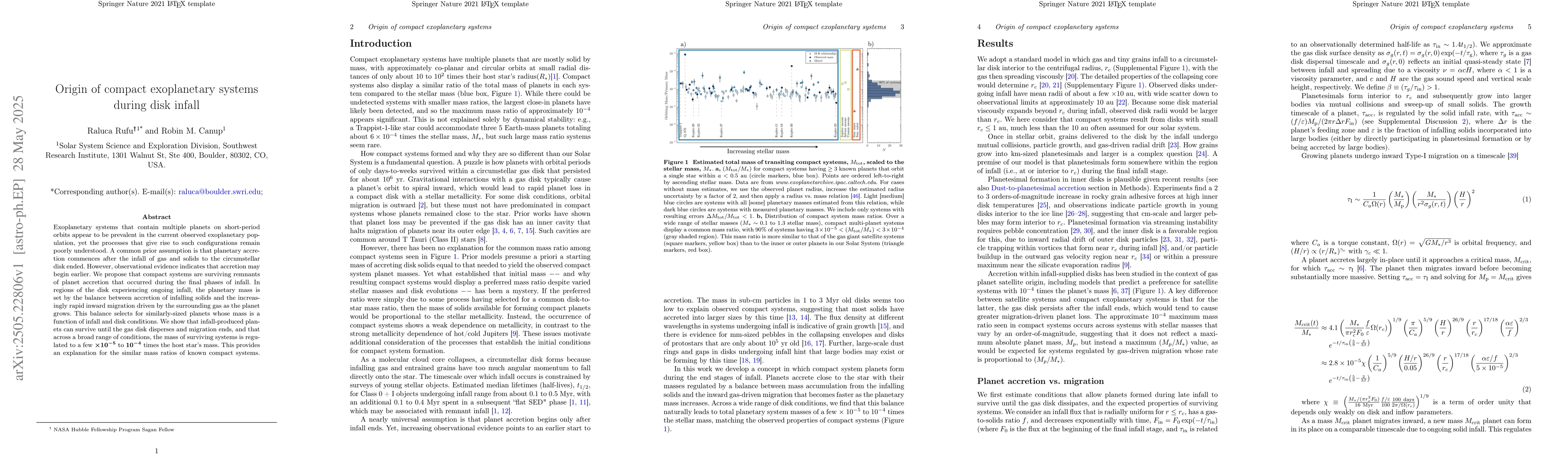 The research proposes that compact exoplanetary systems originate from planet accretion occurring during the final phases of disk infall, challenging the assumption that accretion begins only after disk infall concludes.