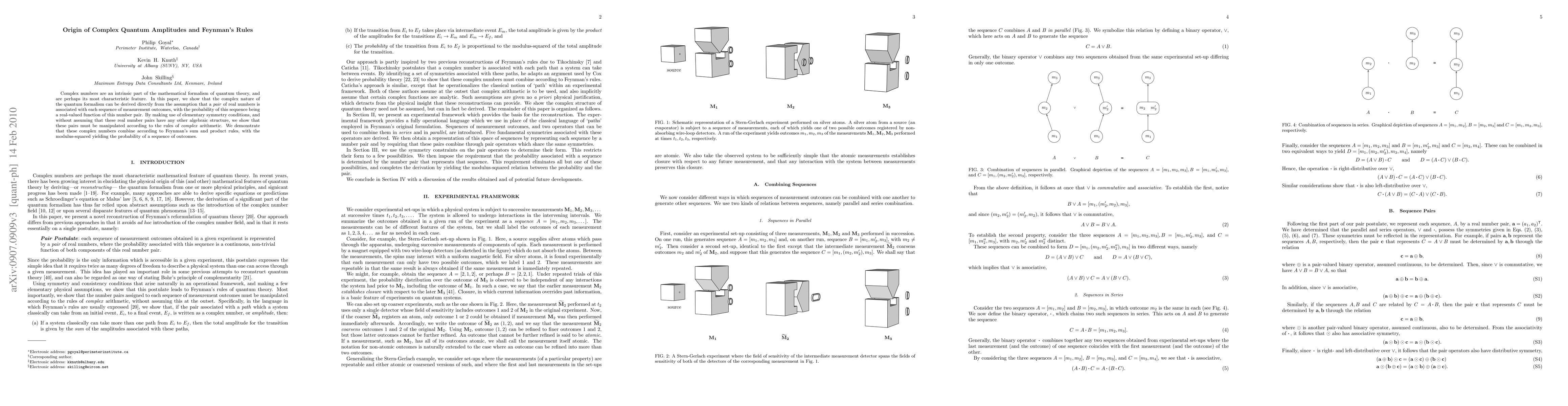 This paper derives the complex nature of quantum theory from the assumption that a pair of real numbers corresponds to each sequence of measurement outcomes, showing that these pairs must follow complex arithmetic rules, including Feynman's sum and product rules, to yield real-valued probabilities.