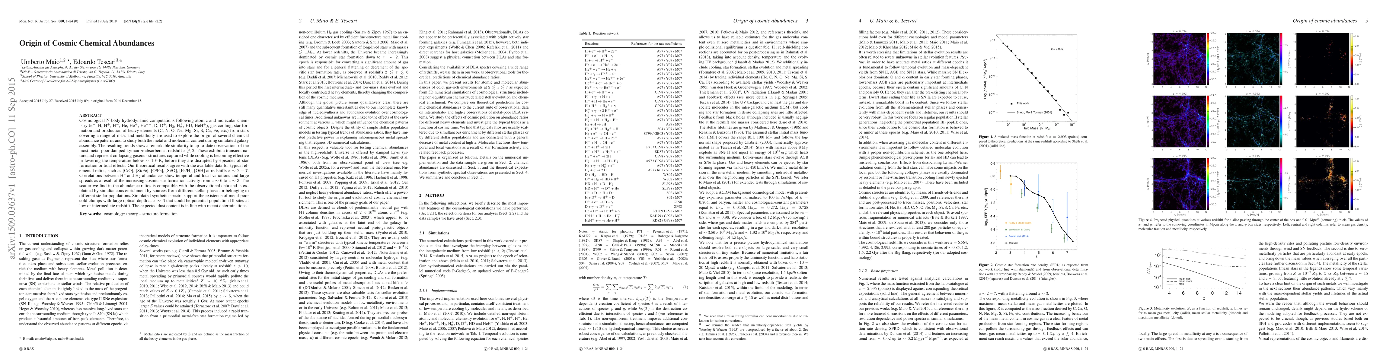 Cosmological N-body hydrodynamic computations following atomic and molecular chemistry (e$^-$, H, H$^+$, H$^-$, He, He$^+$, He$^{++}$, D, D$^+$, H$_2$, H$_2^+$, HD, HeH$^+$), gas cooling, star formation and production of heavy elements (C, N, O, Ne, Mg, Si, S, Ca, Fe, etc.) from stars covering a range of mass and metallicity are used to explore the origin of several chemical abundance patterns and to study both the metal and molecular content during simulated galaxy assembly. The resulting trends show a remarkable similarity to up-to-date observations of the most metal-poor damped Lyman-$\alpha$ absorbers at redshift $z\gtrsim 2$. These exhibit a transient nature and represent collapsing gaseous structures captured while cooling is becoming effective in lowering the temperature below $\sim 10^4\,\rm K$, before they are disrupted by episodes of star formation or tidal effects. Our theoretical results agree with the available data for typical elemental ratios, such as [C/O], [Si/Fe], [O/Fe], [Si/O], [Fe/H], [O/H] at redshifts $z\sim 2-7$. Correlations between HI and H$_2$ abundances show temporal and local variations and large spreads as a result of the increasing cosmic star formation activity from $z\sim 6$ to $z\sim 3$. The scatter we find in the abundance ratios is compatible with the observational data and is explained by simultaneous enrichment by sources from different stellar phases or belonging to different stellar populations. Simulated synthetic spectra support the existence of metal-poor cold clumps with large optical depth at $z\sim 6$ that could be potential population~III sites at low or intermediate redshift. The expected dust content is in line with recent determinations.