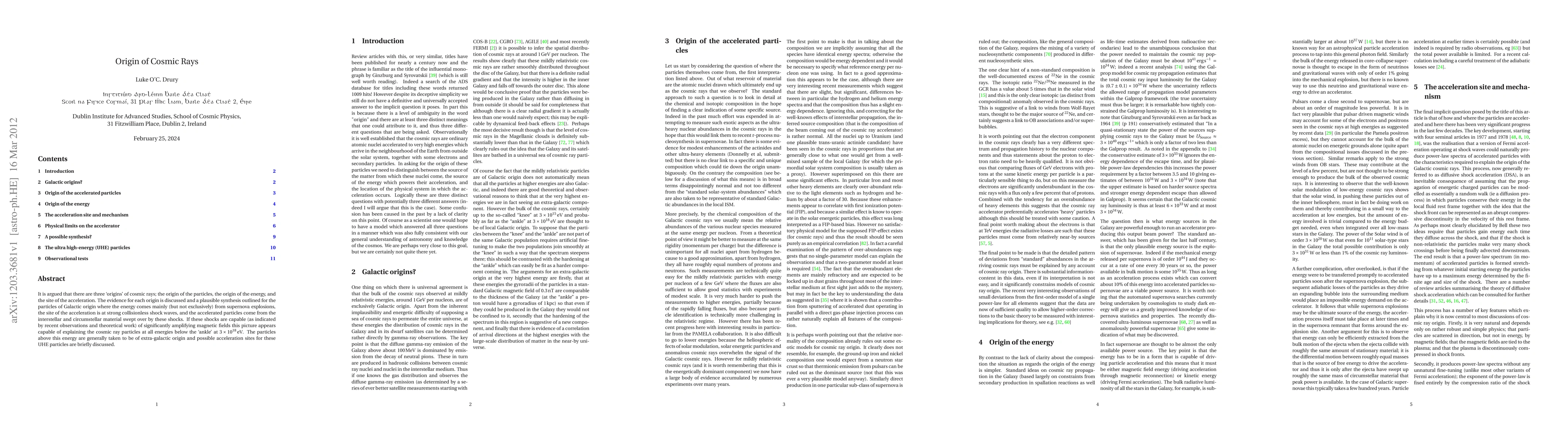 It is argued that there are three `origins' of cosmic rays; the origin of the particles, the origin of the energy, and the site of the acceleration. The evidence for each origin is discussed and a plausible synthesis outlined for the particles of Galactic origin where the energy comes mainly (but not exclusively) from supernova explosions, the site of the acceleration is at strong collisionless shock waves, and the accelerated particles come from the interstellar and circumstellar material swept over by these shocks. If these shocks are capable (as indicated by recent observations and theoretical work) of significantly amplifying magnetic fields this picture appears capable of explaining the cosmic ray particles at all energies below the `ankle' at $3\times10^{18}\,\rm eV$. The particles above this energy are generally taken to be of extra-galactic origin and possible acceleration sites for these UHE particles are briefly discussed.