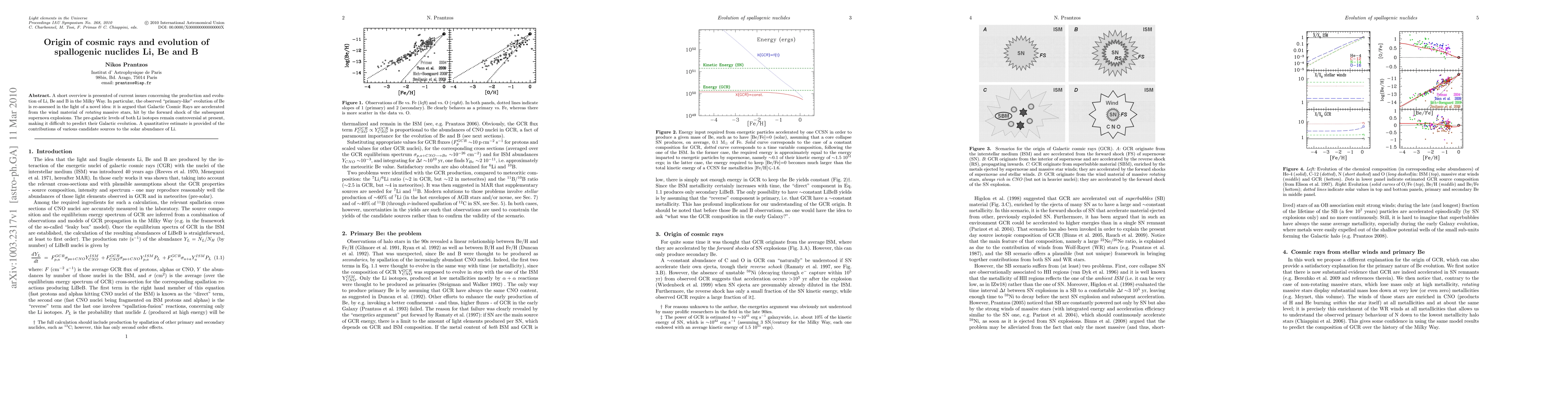 This paper discusses the origin of cosmic rays and the evolution of spallogenic nuclides Li, Be, and B in the Milky Way, proposing that cosmic rays are accelerated from the wind material of massive stars, impacting supernova shock waves. It also assesses the controversial pre-galactic levels of Li isotopes and provides a quantitative estimate of the contributions of various sources to the solar abundance of Li.