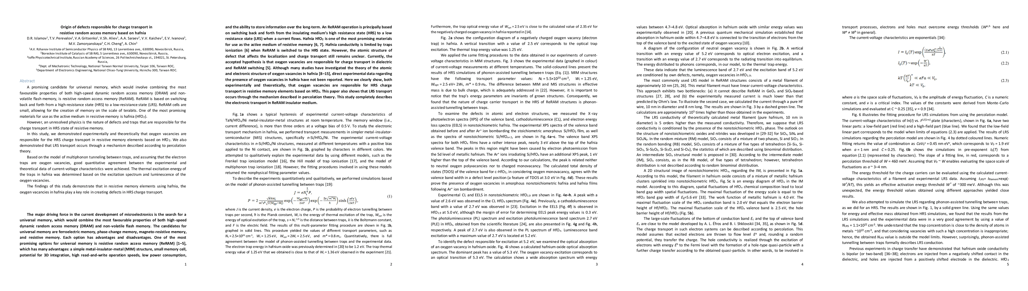 This study investigates the origin of defects responsible for charge transport in hafnia-based resistive random access memory (ReRAM), identifying oxygen vacancies as the primary defects in the high-resistance state (HRS). The low-resistance state (LRS) transport is explained through percolation theory, with experimental and theoretical data showing good agreement.