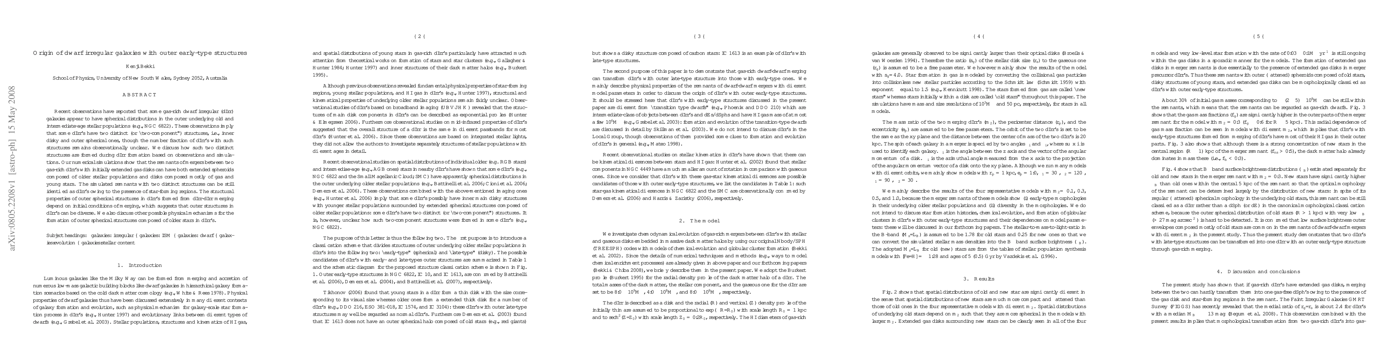 Recent observations have reported that some gas-rich dwarf irregular (dIrr) galaxies appear to have spherical distributions in the outer underlying old and intermediate-age stellar populations (e.g., NGC 6822). These observations imply that some dIrr's have two distinct (or ``two-component'') structures, i.e., inner disky and outer spherical ones, though the number fraction of dIrr's with such structures remains observationally unclear. We discuss how such two distinct structures are formed during dIrr formation based on observations and simulations. Our numerical simulations show that the remnants of mergers between two gas-rich dIrr's with initially extended gas disks can have both extended spheroids composed of older stellar populations and disks composed mostly of gas and young stars. The simulated remnants with two distinct structures can be still identified as dIrr's owing to the presence of star-forming regions. The structural properties of outer spherical structures in dIrr's formed from dIrr-dIrr merging depend on initial conditions of merging, which suggests that outer structures in dIrr's can be diverse. We also discuss other possible physical mechanisms for the formation of outer spherical structures composed of older stars in dIrr's.