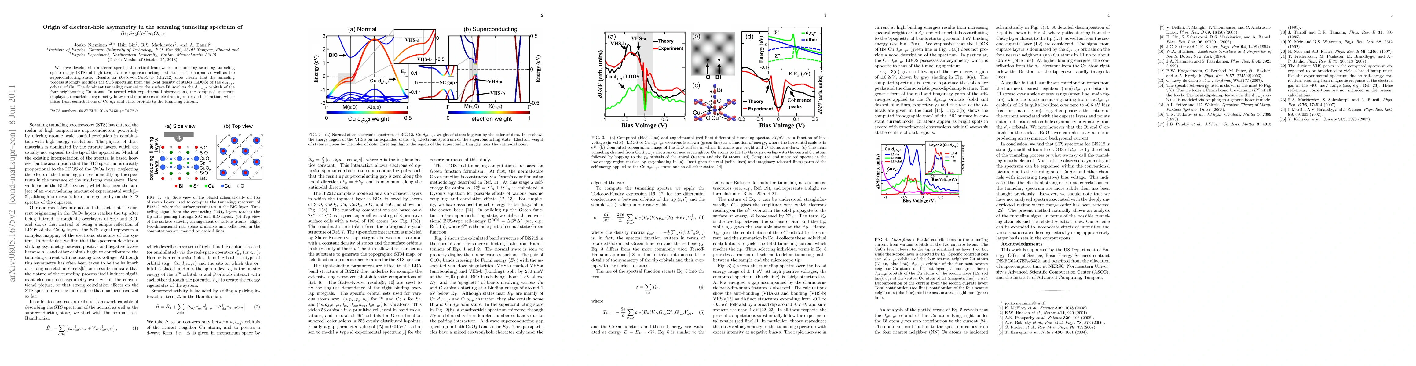 This paper develops a theoretical framework to model scanning tunneling spectroscopy of high-temperature superconductors, revealing that electron-hole asymmetry in the spectrum of Bi2212 arises from tunneling contributions involving Cu $d_{z^2}$ and neighboring Cu $d_{x^2-y^2}$ orbitals. The asymmetry is due to the dominant tunneling channel to the surface Bi.