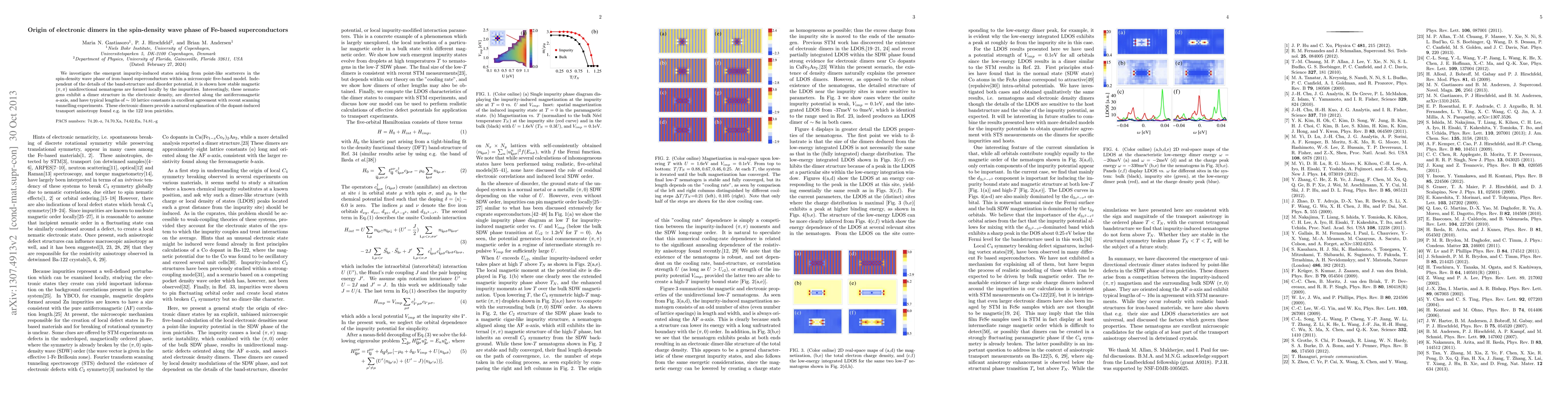 We investigate the emergent impurity-induced states arising from point-like scatterers in the spin-density wave phase of iron-based superconductors within a microscopic five-band model. Independent of the details of the band-structure and disorder potential, it is shown how stable magnetic (pi,pi) unidirectional nematogens are formed locally by the impurities. Interestingly, these nematogens exhibit a dimer structure in the electronic density, are directed along the antiferromagnetic a-axis, and have typical lengths of order 10 lattice constants in excellent agreement with recent scanning tunnelling experiments. These electronic dimers provide a natural explanation of the dopant-induced transport anisotropy found e.g. in the 122 iron pnictides.
