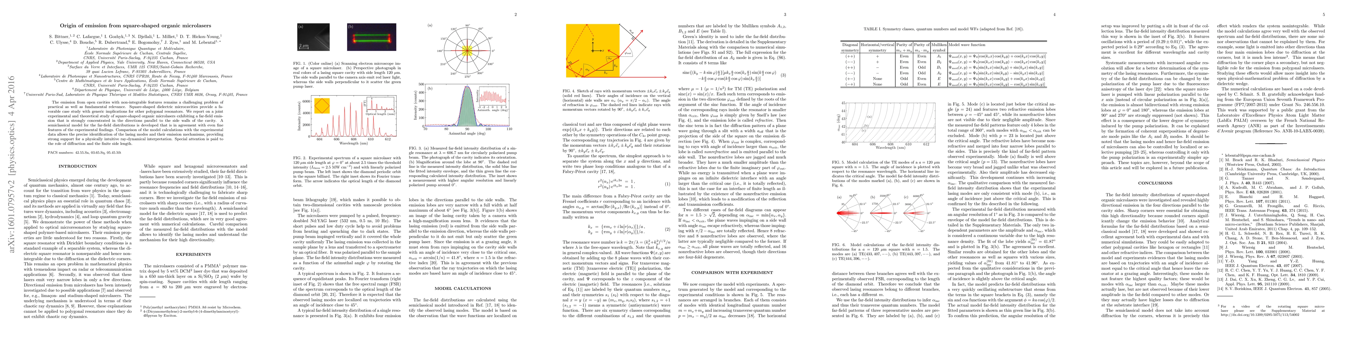 This paper presents a joint experimental and theoretical study on square-shaped organic microlasers, revealing concentrated far-field emission parallel to the side walls. A semiclassical model accurately describes the emission patterns, identifying lasing modes and their mechanisms, emphasizing the roles of diffraction and finite side lengths.