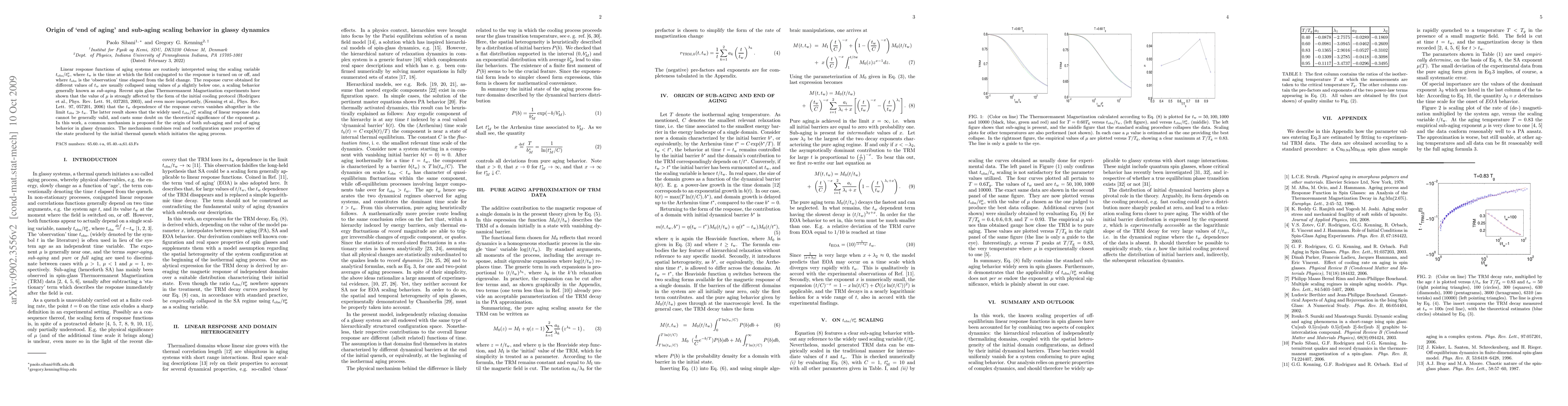 Linear response functions of aging systems are routinely interpreted using the scaling variable $t_{\rm obs}/t_{\rm w}^\mu$,where $t_{\rm w}$ is the time at which the field conjugated to the response is turned on or off, and where $t_{\rm obs}$ is the `observation' time elapsed from the field change. The response curve obtained for different values of $t_w$ are usually collapsed using values of $\mu$ slightly below one, a scaling behavior generally known as \emph{sub-aging}. Recent spin glass Thermoremanent Magnetization experiments have shown that the value of $\mu$ is strongly affected by the form of the initial cooling protocol (Rodriguez et al., Phys. Rev. Lett. 91, 037203, 2003), and even more importantly, (Kenning et al., Phys. Rev. Lett. 97, 057201, 2006) that the $t_{\rm w}$ dependence of the response curves vanishes altogether in the limit $t_{\rm obs} \gg t_{\rm w}$. The latter result shows that the widely used $t_{\rm obs}/t_{\rm w}^\mu$ scaling of linear response data cannot be generally valid, and casts some doubt on the theoretical significance of the exponent $\mu$. In this work, a common mechanism is proposed for the origin of both sub-aging and end of aging behavior in glassy dynamics. The mechanism combines real and configuration space properties of the state produced by the initial thermal quench which initiates the aging process.