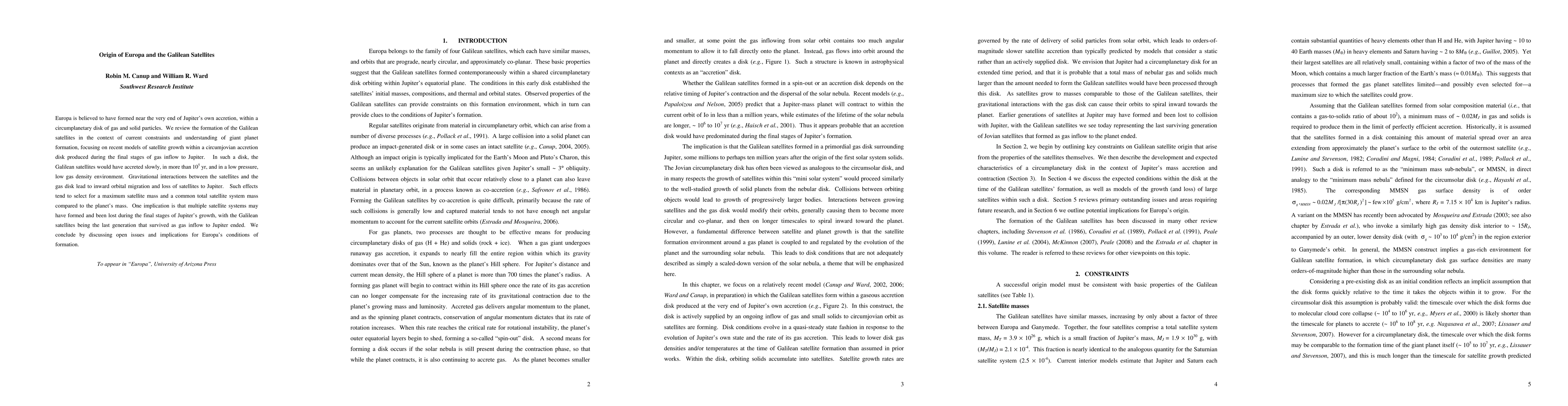 This paper reviews the formation of Europa and the Galilean satellites, suggesting they formed in a circumjovian disk during Jupiter's final accretion stages. The satellites likely accreted slowly over 10^5 years in a low-density environment, with gravitational interactions leading to their inward migration and potential loss to Jupiter.