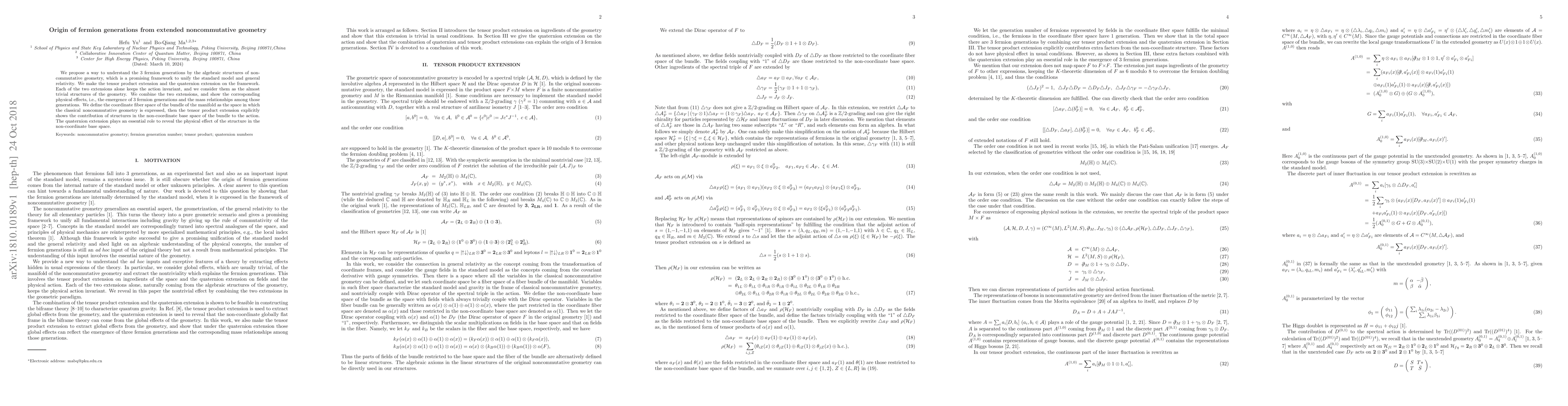 This paper proposes a novel approach using extended noncommutative geometry to explain the origin of the three fermion generations, combining tensor product and quaternion extensions to reveal mass relationships and the emergence of these generations. The framework aims to unify the standard model and general relativity.
