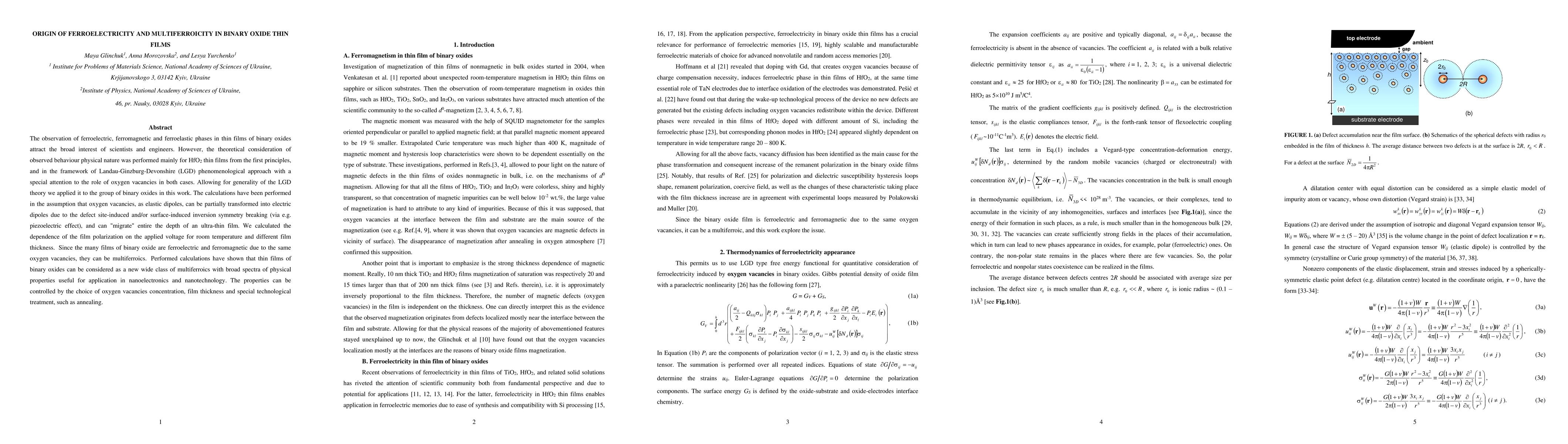 Researchers discovered that thin films of binary oxides can exhibit ferroelectricity, ferromagnetism, and ferroelasticity due to oxygen vacancies, which can migrate throughout the film, making them a new class of multiferroics. These properties can be controlled by adjusting oxygen vacancy concentration, film thickness, and technological treatment.