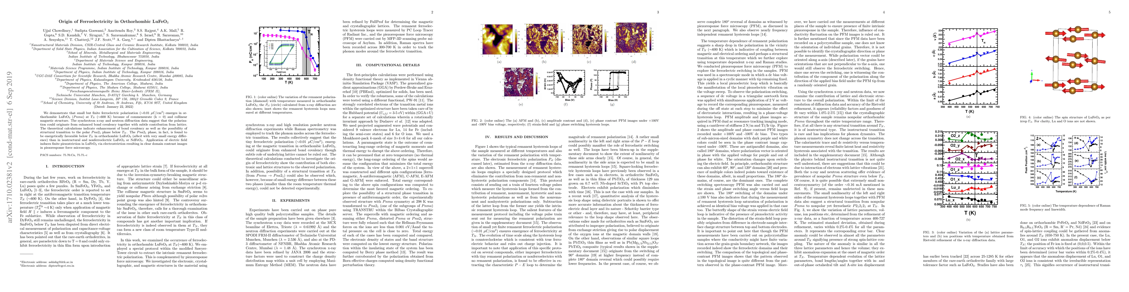 Ferroelectricity is discovered in orthorhombic LuFeO$_3$ at a temperature of around 600 K due to enhanced bond covalency and subtle lattice contributions. This phenomenon results in a small but finite polarization.