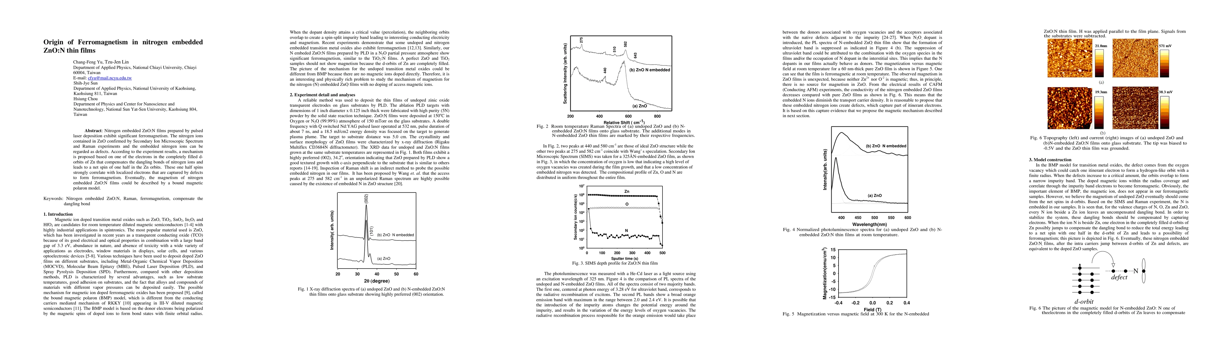 This study investigates the origin of ferromagnetism in nitrogen-embedded ZnO:N thin films prepared via pulsed laser deposition, revealing that nitrogen ions act as defects. A proposed mechanism suggests that one electron from Zn compensates nitrogen dangling bonds, leading to localized electron capture by defects and ferromagnetism described by a bound magnetic polaron model.