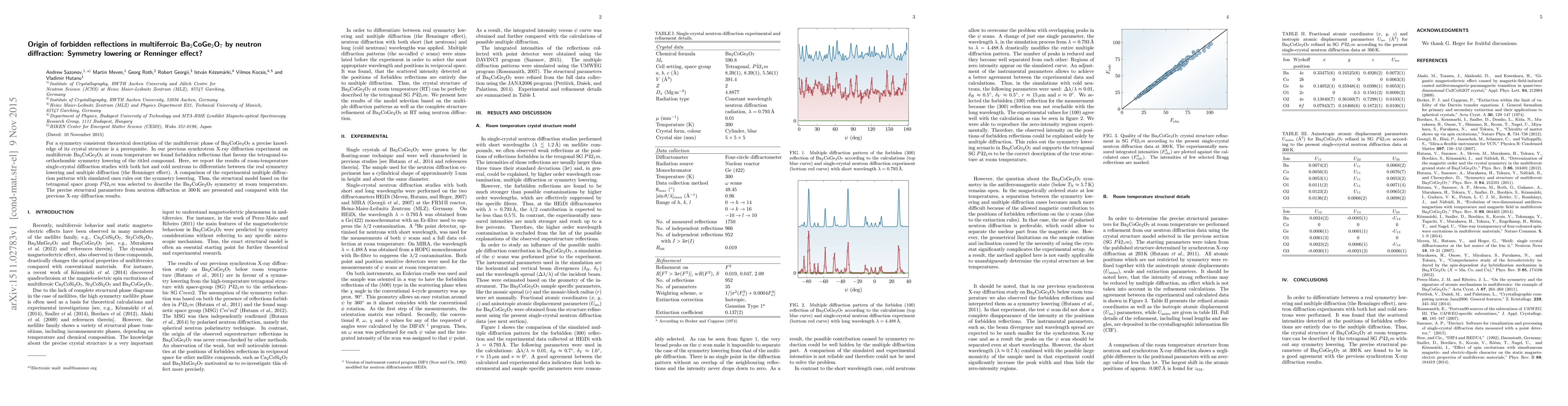 This paper investigates the origin of forbidden reflections in the multiferroic Ba$_2$CoGe$_2$O$_7$ using neutron diffraction, concluding that the observed reflections are due to the Renninger effect rather than a symmetry lowering. The study confirms the tetragonal-to-orthorhombic space group $P\bar{4}2_1m$ for Ba$_2$CoGe$_2$O$_7$ at room temperature.