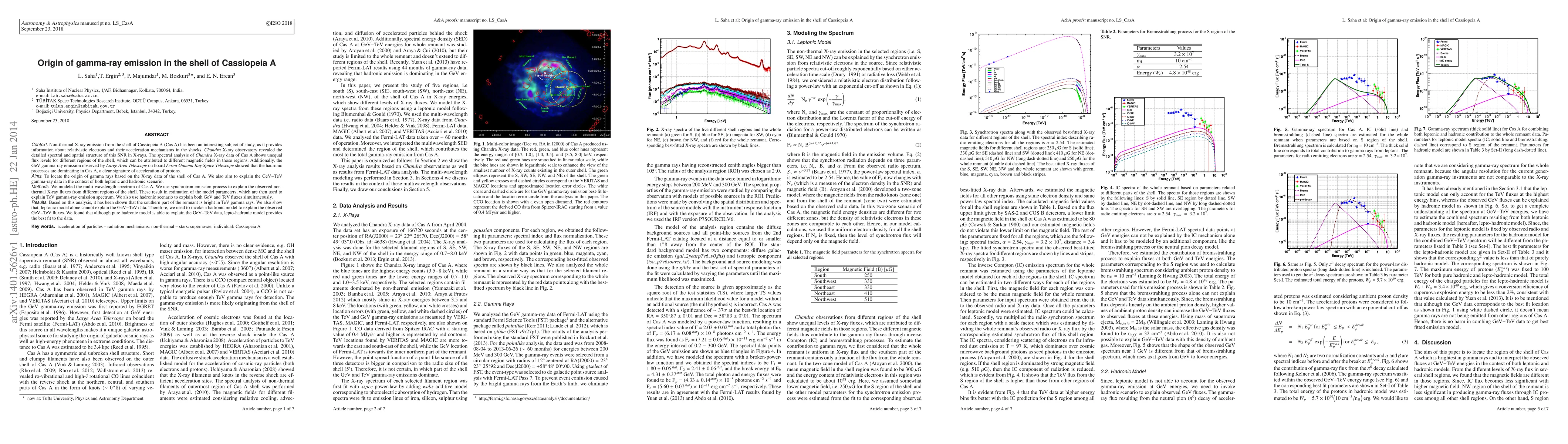 This paper investigates the origin of gamma-ray emission in the shell of Cassiopeia A, finding that both leptonic and hadronic processes contribute to the GeV-TeV gamma-ray spectrum. The study concludes that a lepto-hadronic model provides the best fit for the observed gamma-ray data, indicating the necessity of combining both mechanisms to explain the emission.