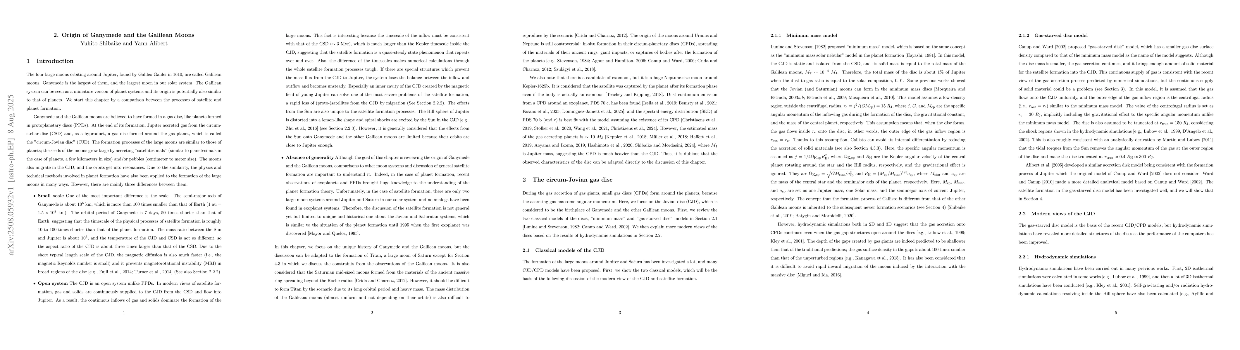 Ganymede and the Galilean moons formed in a small gas disc around the gas-accreting proto-Jupiter, known as the circum-Jovian disc (CJD). The formation process of the satellites occurs in three steps: the formation of the CJD from the accreting gas onto Jupiter, the transport of solid materials from the circumstellar disc (CSD) to the CJD, and the formation of the satellites inside the CJD from the supplied materials. Recent 3D hydrodynamical simulations have revealed the basic structure of the CJD. However, the detailed structures, which influence the transport of materials and the formation of satellites, remain controversial. Specifically, for the transport of solid materials, pebbles (~cm-m) drifting from the outer region of the CSD are trapped at the gas gap created by Jupiter and cannot be directly supplied to the CJD. There are two alternative mechanisms for supplying solid material: small dust particles accrete onto the CJD together with the gas, or planetesimals, which are less affected by the gas, are captured by the CJD. The satellite formation scenarios are also divided into two groups: satellitesimal and pebble accretion. In both scenarios, the growth timescale of the satellites (~0.1-10 Myr) depends on the continuous supply of material to the CJD. How to stop the migration of forming satellites is also an important issue. The combination of inward migration and its cessation is consistent with the resonant orbits of the three innermost Galilean moons. The compositional gradient and the degree of differentiation of the moons further constrain the proposed formation scenarios. However, none of the proposed scenarios has been fully accepted, and future observations, such as those from the JUICE mission, will provide stricter constraints to define the true origin of Ganymede and the Galilean moons.