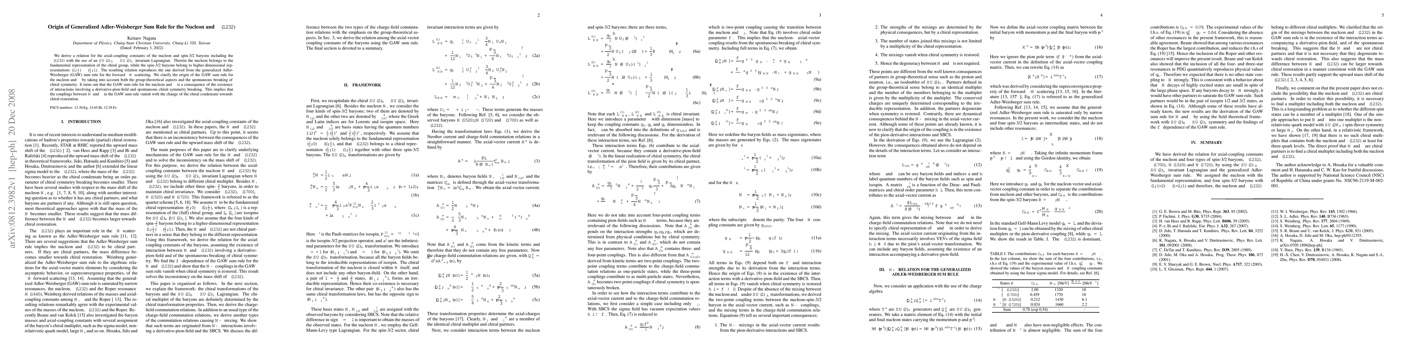 This paper derives a relation for nucleon and Delta(1232) axial-coupling constants using an SU(2)_R×SU(2)_L invariant Lagrangian, clarifying the origin of the generalized Adler-Weisberger sum rule. The findings suggest the sum rule emerges from derivative-pion-field interactions and spontaneous chiral symmetry breaking, implying couplings between N and Delta in the sum rule would disappear as chiral symmetry is restored.