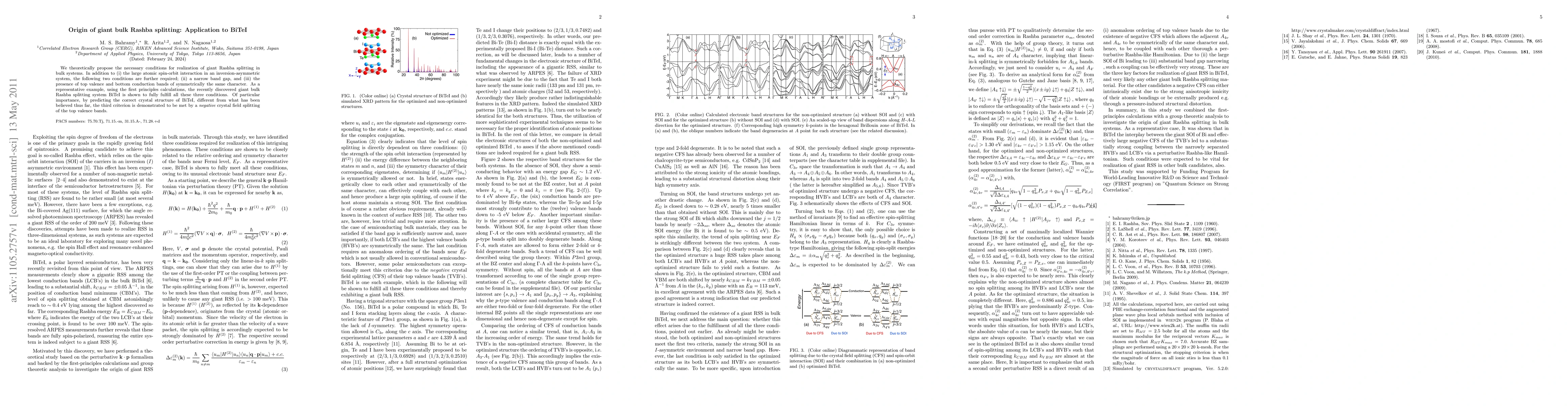 This paper theoretically identifies the conditions for giant bulk Rashba splitting, emphasizing large atomic spin-orbit interaction, a narrow band gap, and symmetrical valence and conduction bands. BiTeI is demonstrated to meet these criteria, particularly through a predicted crystal structure that fulfills the third condition via negative crystal field splitting.