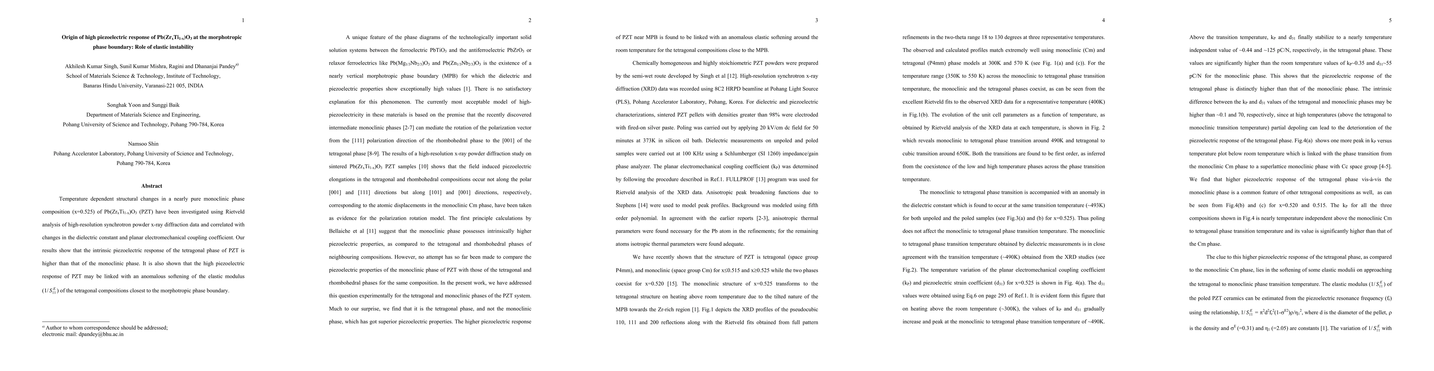 This study investigates the temperature-dependent structural changes in Pb(Zr_xTi_1-x)O_3 (PZT) near the morphotropic phase boundary, revealing that the tetragonal phase exhibits a higher intrinsic piezoelectric response than the monoclinic phase. The high piezoelectric response is linked to an anomalous softening of the elastic modulus near the morphotropic phase boundary.