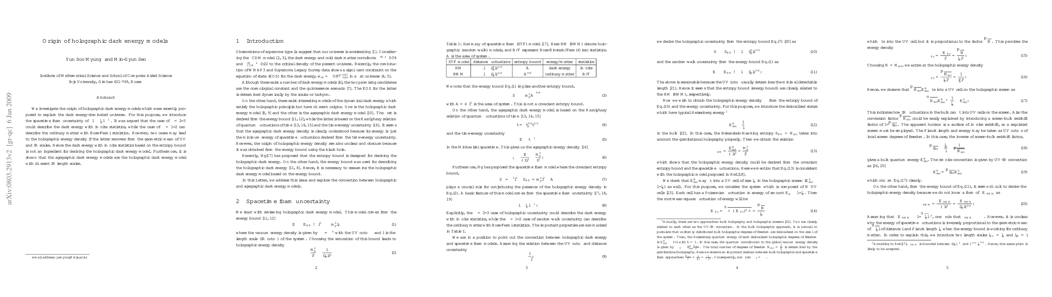 This paper explores the origins of holographic dark energy models, proposing that the spacetime foam uncertainty can describe the universe's dark energy and ordinary matter. It concludes that neither infinite statistics nor the entropy bound are necessary for deriving these models, but rather different IR length scales can lead to holographic dark energy.