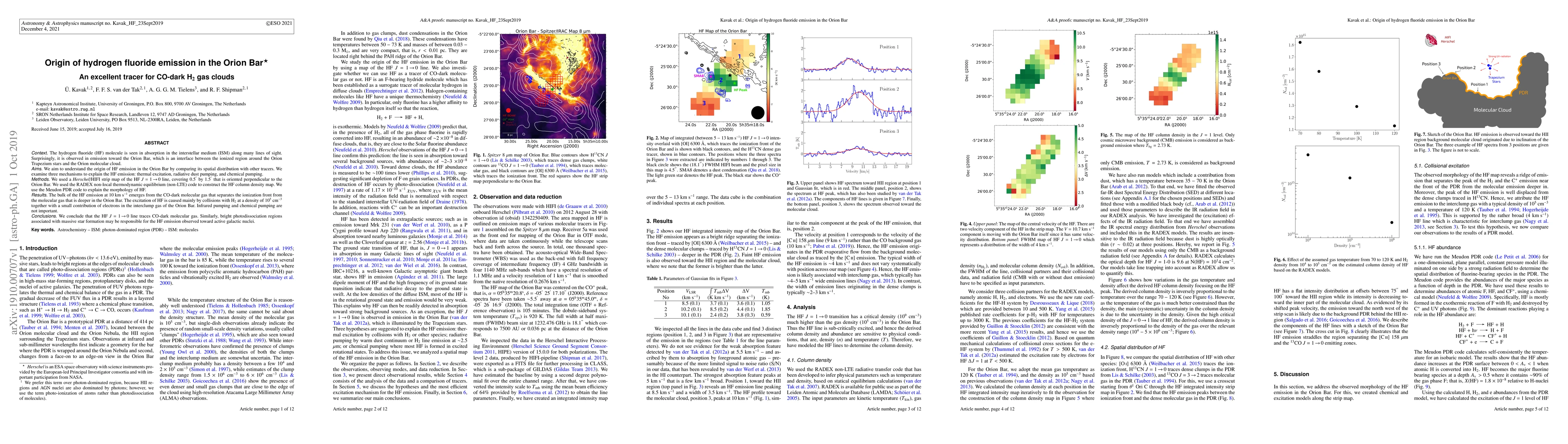 Hydrogen fluoride emission is found in the Orion Bar, tracing CO-dark molecular gas; its main excitation mechanism is collisions with H2 at high densities.
