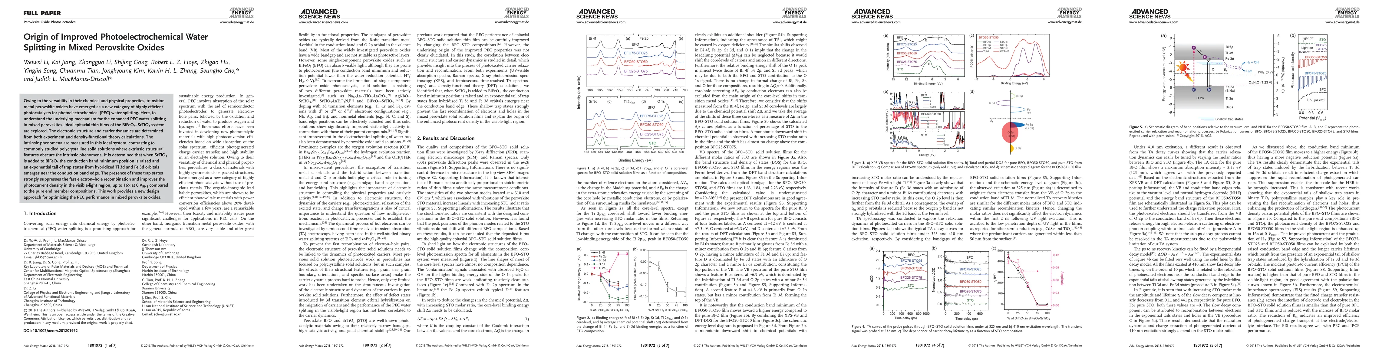 This study investigates the enhanced photoelectrochemical water splitting in mixed perovskite oxides, specifically the BiFeO3-SrTiO3 system, revealing that the addition of SrTiO3 raises the conduction band minimum and introduces trap states that suppress electron-hole recombination, significantly improving photocurrent density. The findings suggest a new strategy for optimizing photoelectrochemical performance in mixed perovskite oxides.