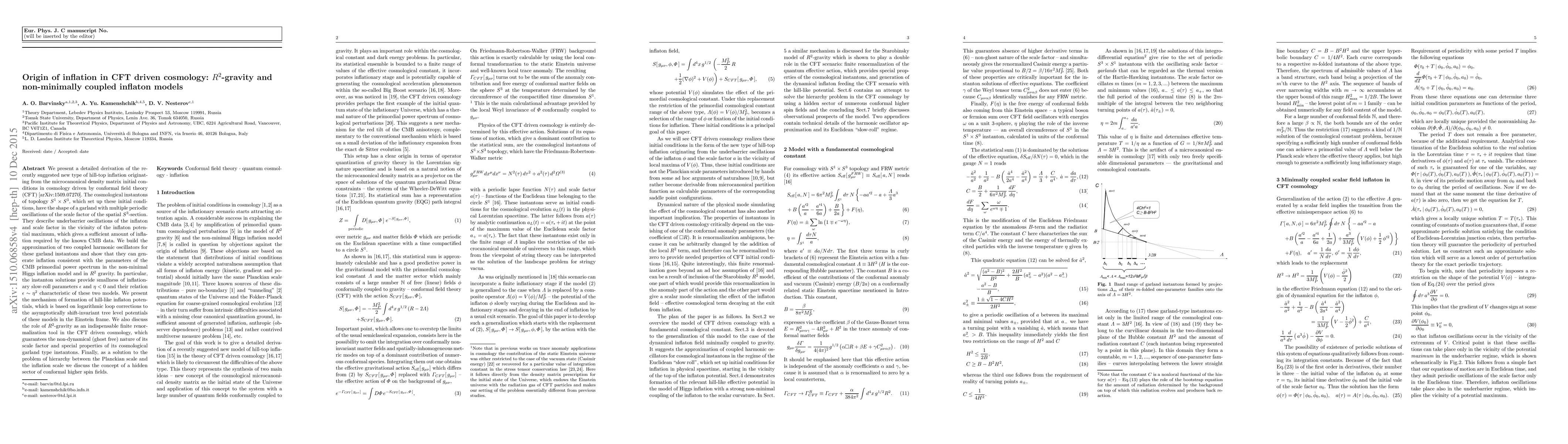 We present a detailed derivation of the recently suggested new type of hill-top inflation [arXiv:1509.07270] originating from the microcanonical density matrix initial conditions in cosmology driven by conformal field theory (CFT). The cosmological instantons of topology $S^1\times S^3$, which set up these initial conditions, have the shape of a garland with multiple periodic oscillations of the scale factor of the spatial $S^3$-section. They describe underbarrier oscillations of the inflaton and scale factor in the vicinity of the inflaton potential maximum, which gives a sufficient amount of inflation required by the known CMB data. We build the approximation of two coupled harmonic oscillators for these garland instantons and show that they can generate inflation consistent with the parameters of the CMB primordial power spectrum in the non-minimal Higgs inflation model and in $R^2$ gravity. In particular, the instanton solutions provide smallness of inflationary slow-roll parameters $\epsilon$ and $\eta<0$ and their relation $\epsilon\sim\eta^2$ characteristic of these two models. We present the mechanism of formation of hill-like inflaton potentials, which is based on logarithmic loop corrections to the asymptotically shift-invariant tree level potentials of these models in the Einstein frame. We also discuss the role of $R^2$-gravity as an indispensable finite renormalization tool in the CFT driven cosmology, which guarantees the non-dynamical (ghost free) nature of its scale factor and special properties of its cosmological garland type instantons. Finally, as a solution to the problem of hierarchy between the Planckian scale and the inflation scale we discuss the concept of a hidden sector of conformal higher spin fields.